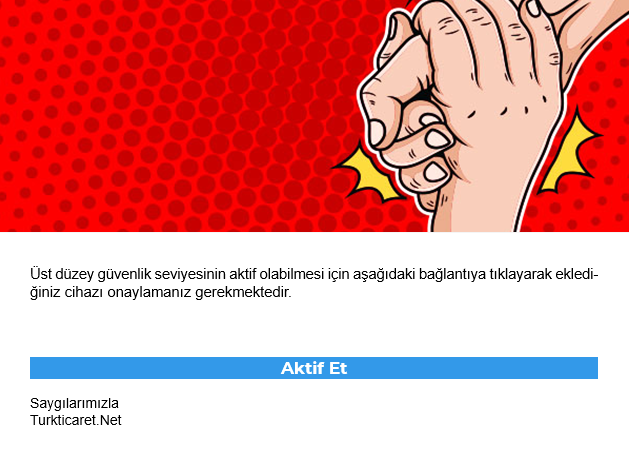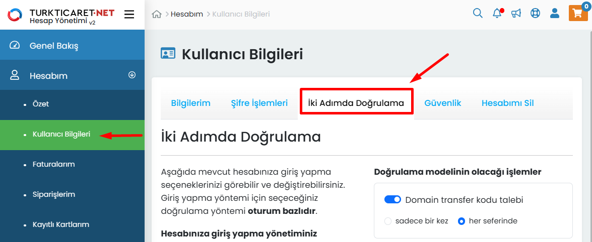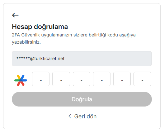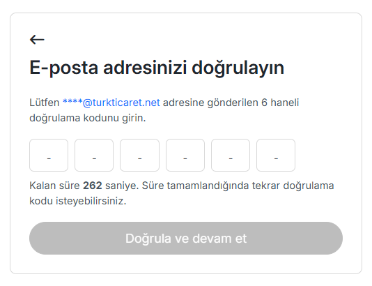 Örnek olarak “Kullanıcı Üye girişi” işlemi için iki adımda doğrulama yöntemlerinden “E-posta ile doğrulama” yöntemini tercih ettiğiniz takdirde, hesabınıza her giriş yaptığınızda Turkticaret.Net hesabınıza tanımlı mail adresinize doğrulama kodu gelecektir. Verilen süre içerisinde kodu girerek iki katmanlı koruma sağlamış olursunuz.