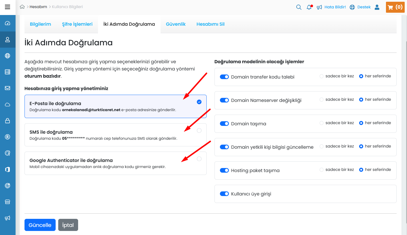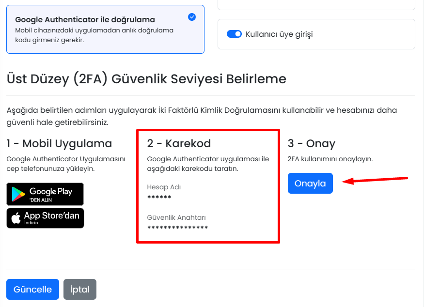 Google Authenticator ile doğrulama yöntemini Aktifleştirmek için;