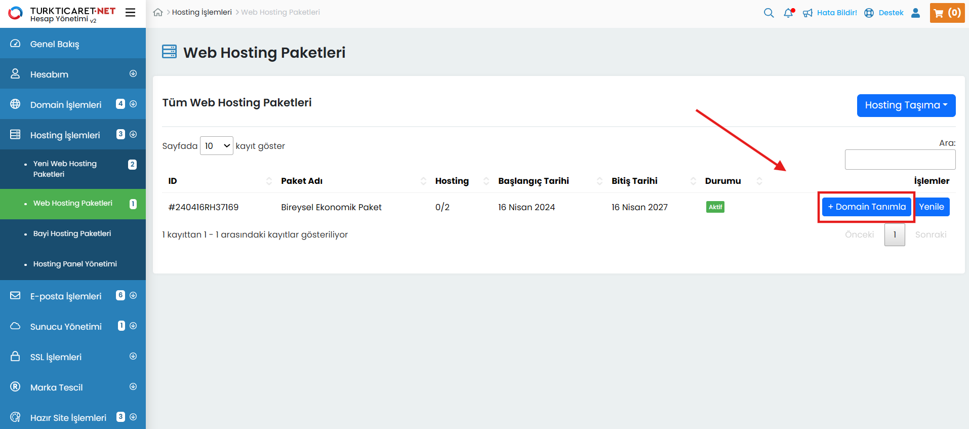 Hosting hizmetinizi aktif bir şekilde kullanabilmek için, sahip olduğunuz alan adınızı kullanıcı paneliniz üzerinden ilgili hosting hizmetiniz ile eşleştirmeniz gerekir. Panel üzerinden yapılan bu tanımlama işlemi, teknik ayarlara ihtiyaç duymadan hızlı ve pratik bir şekilde tamamlanabilir. Bu işlem sayesinde alan adınız, satın aldığınız hosting paketi ile eşleştirilir ve ziyaretçiler, alan adınızı kullanarak Web sitenize erişebilir.