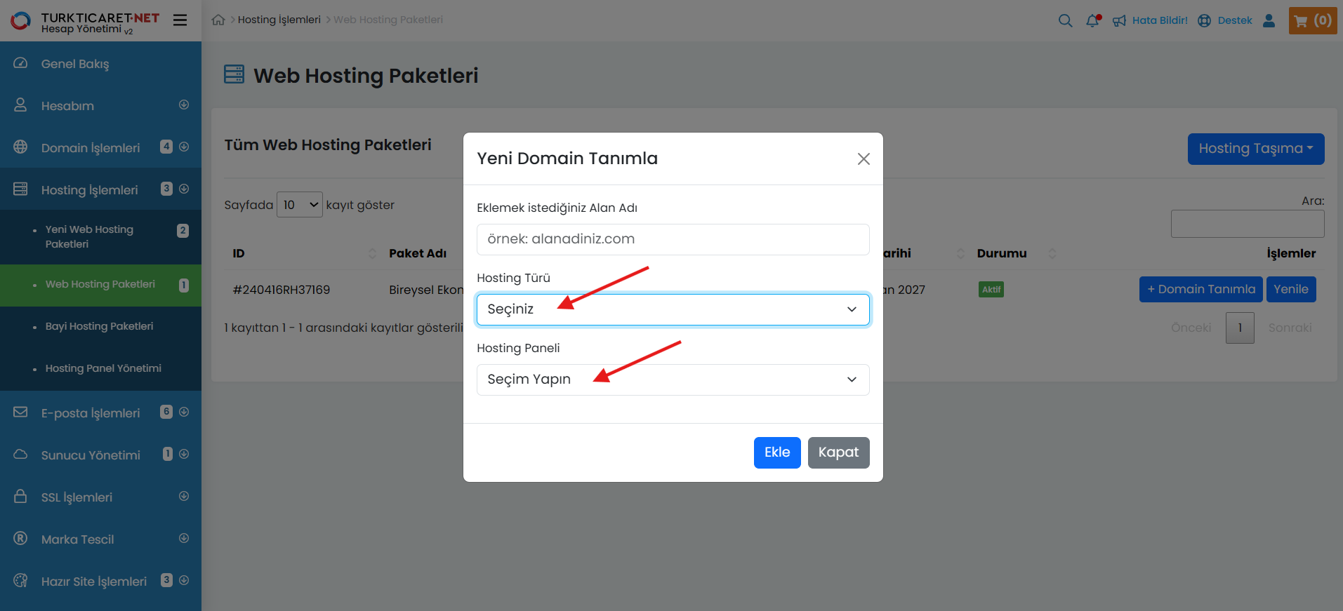 Turkticaret.Net Hosting hizmeti, web sitenizin barındırma ihtiyaçlarına yönelik hızlı, güvenilir ve kullanıcı dostu çözümler sunar. Hosting işlemlerinizi yönetmek için ihtiyaç duyduğunuz bilgilere bu bölümden ulaşabilirsiniz.