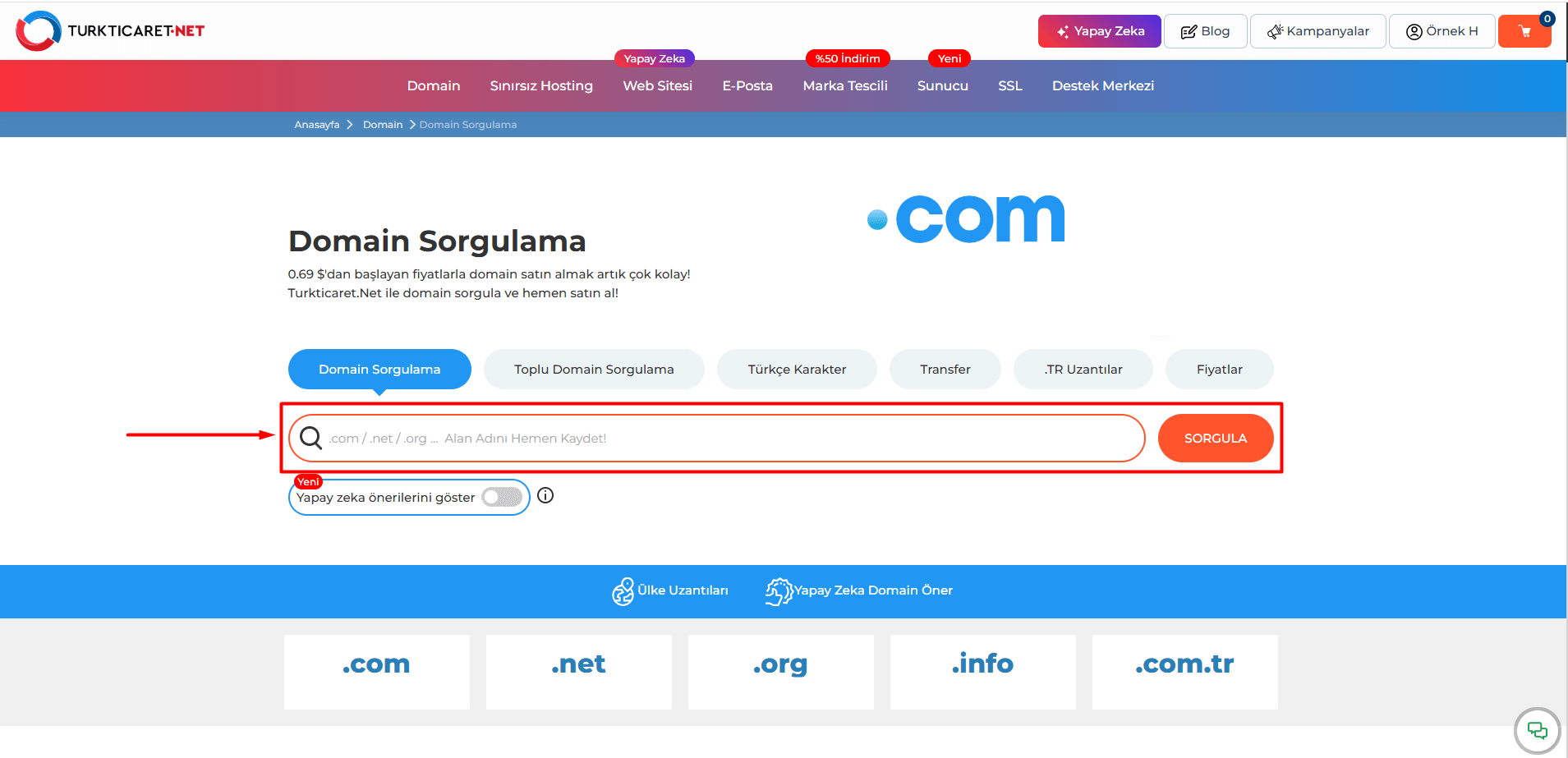 3. Arama kutusuna, tescil etmek istediğiniz alan adını uzantı ile birlikte yazın (örnek: ornekalanadi.com). Yapay zeka önerilerini de almak isteseniz “Yapay zeka önerilerini göster” seçeneğini aktif duruma getirin ve “Sorgula” butonuna tıklayın. Birden fazla alan adı almak istiyorsanız “Toplu Domain Sorgulama” butonuna tıklayarak devam edebilirsiniz.