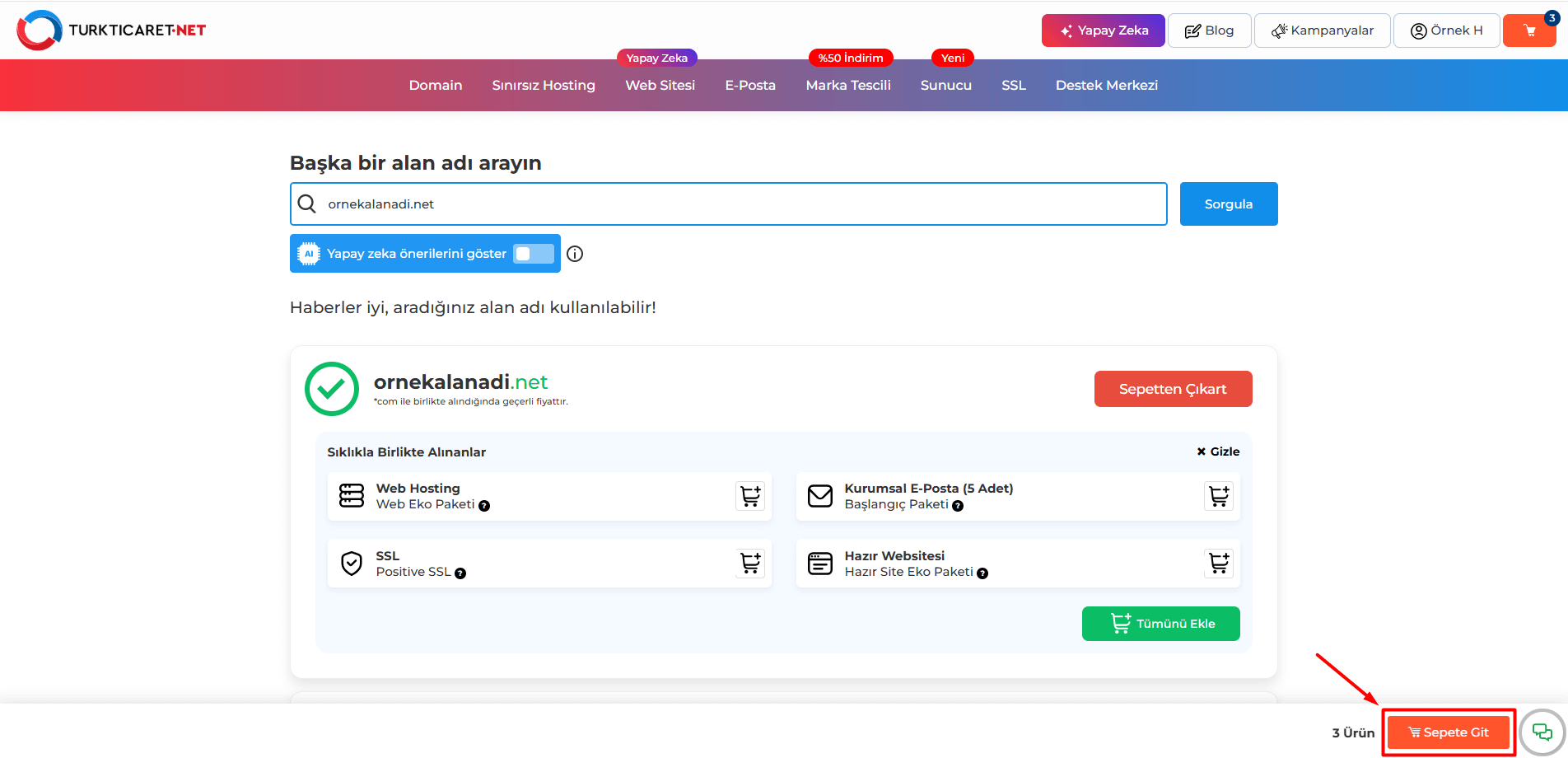 5. Alan adını sepete ekledikten sonra sayfanın aşağısında bulunan “Sepete Git” butonuna tıklayın.