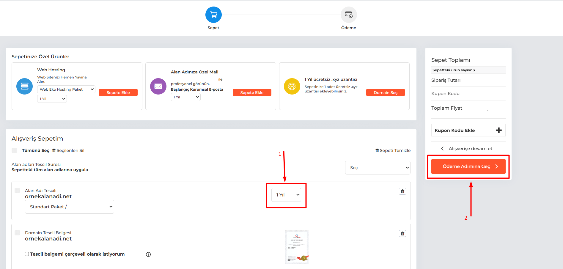 6. Sepete ulaştığınız zaman, alan adınız için talep edilen tescil ücretini görebilirsiniz. Ek olarak, tescil etmek istediğiniz alan adının süresini uzantıya bağlı olarak birden fazla yıl olacak şekilde belirleyebilirsiniz. Bu sayede alan adı kullanım süresi, seçtiğiniz yıl kadar artırılacaktır. Satın almak istediğiniz alan adını sepete eklediğiniz zaman otomatik olarak “Domain Tescil Belgesi” de (online ve fiziki) eklenmektedir. Domain Tescil Belgesi, alan adının size ait olduğunu belirten belgedir. Tercihinize göre tescil belgesini alabilirsiniz veya sepetten silebilirsiniz. Sepetinizi inceledikten sonra “Ödeme Adımına Geç” butonuna tıklayın.