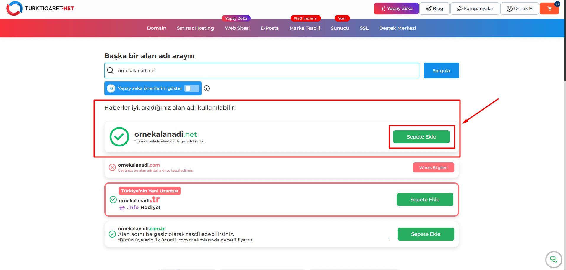 4. Sorgulama işlemi tamamlandığında, ekranda alan adının müsaitlik durumu ve varsa alternatif alan adı önerileri listelenecektir. Eğer sorguladığınız alan adı için “Üzgünüz, bu alan adı daha önce tescil edilmiş.” uyarısını görüyorsanız, ilgili alan adı başka bir kullanıcı tarafından tescil edilmiş olabilir. Bu durumda, ekranda sunulan öneriler arasından farklı uzantılara sahip alan adlarını (.net, .org gibi) veya alternatif alan adlarını inceleyerek size en uygun olanı seçebilirsiniz. Ancak ekranda “Haberler iyi, aradığınız alan adı kullanılabilir!” uyarısını görüyorsanız, aradığınız alan adı müsait durumdadır ve satın alabilirsiniz demektir. Bu durumda alan adının yanında bulunan “Sepete Ekle” butonuna tıklayın.