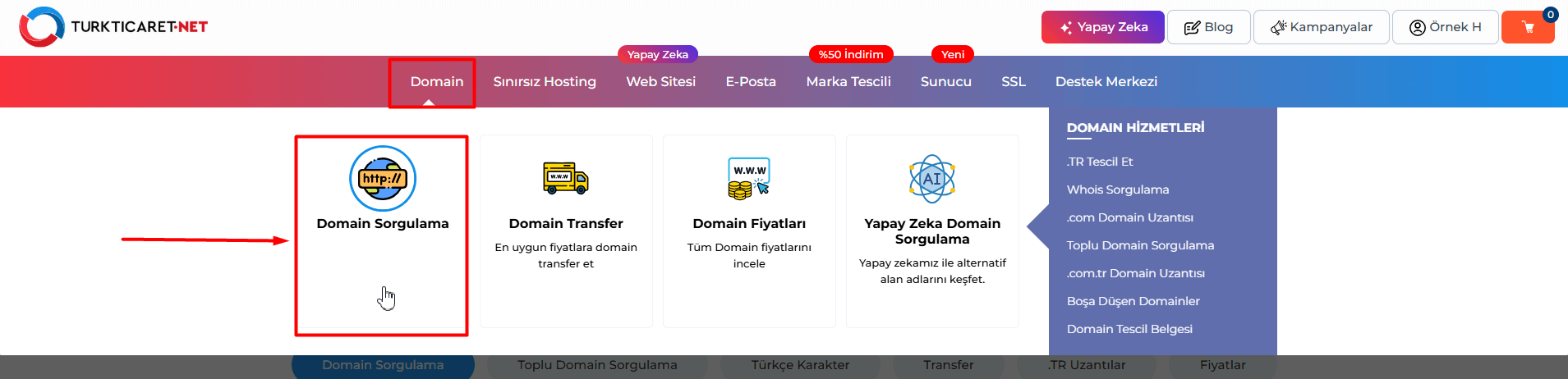 2. Turkticaret.Net web sitesine erişin. Sayfanın üst bölümünde bulunan “Domain > Domain Sorgulama” butonuna tıklayın.