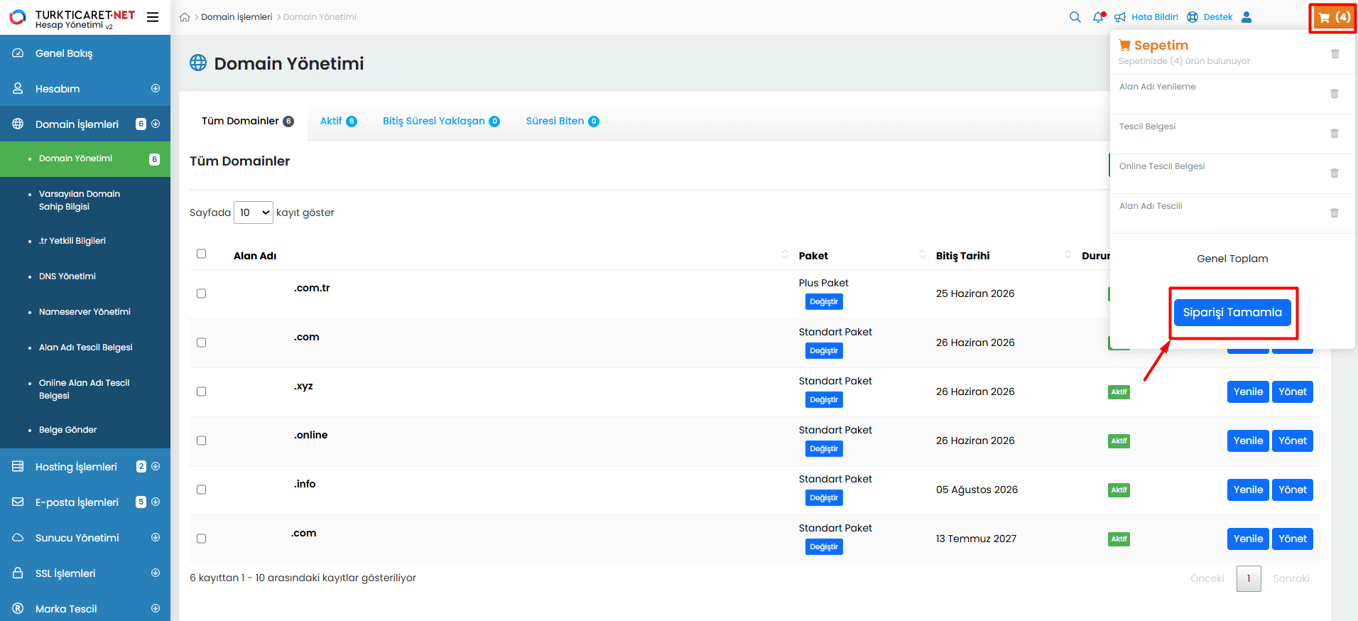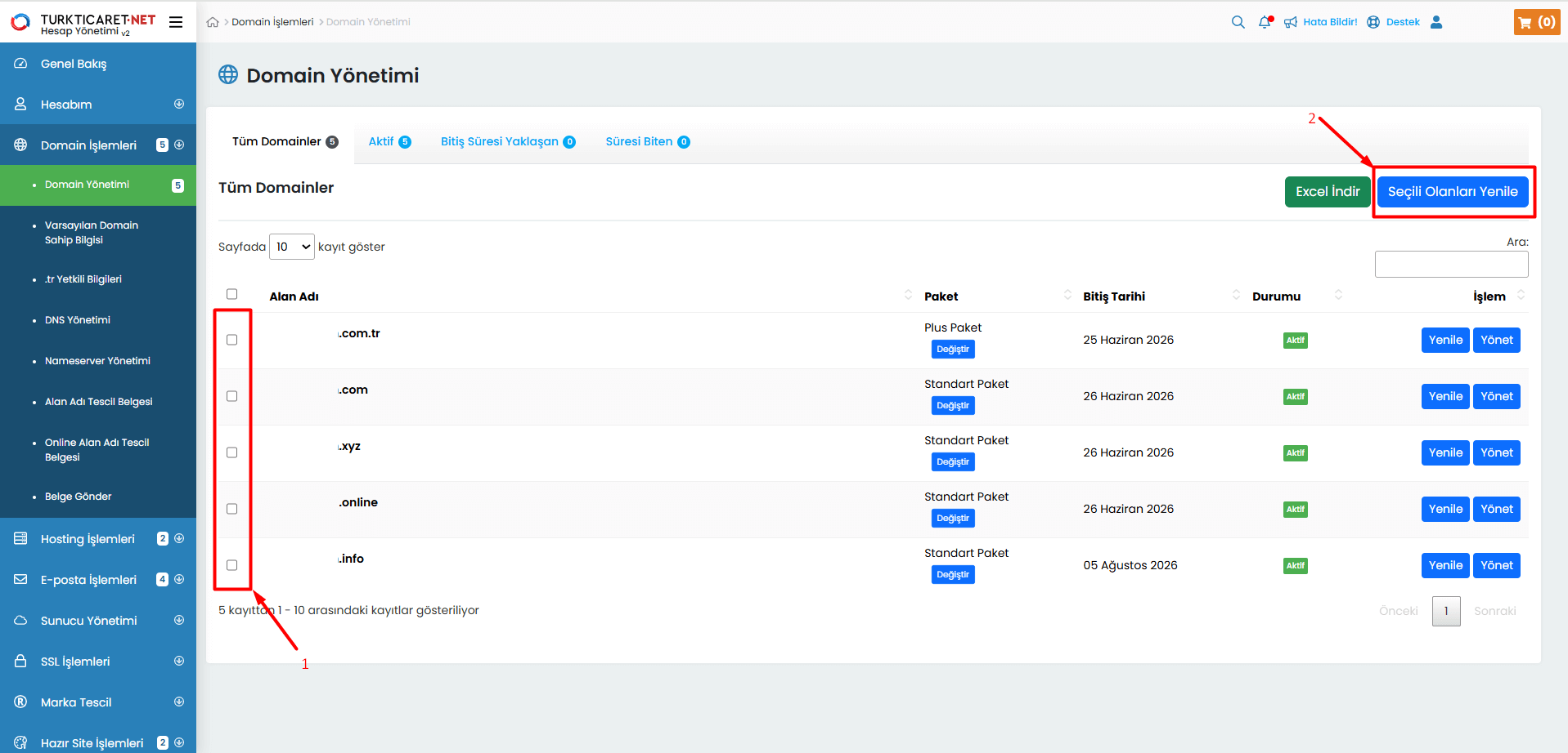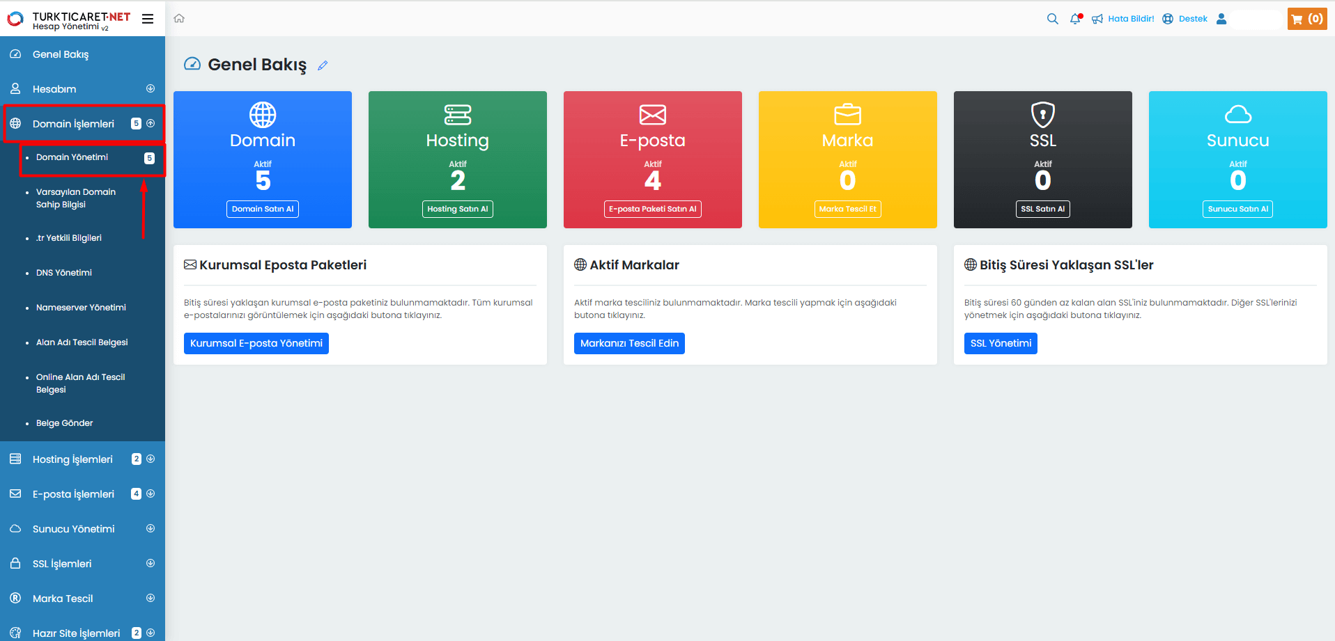 Turkticaret.Net paneliniz üzerinden alan adınızla ilgili yenileme, transfer, DNS yönetimi ve diğer işlemleri gerçekleştirebileceğiniz, aynı zamanda bu konularla ilgili detaylı bilgilere ulaşabileceğiniz alandır.