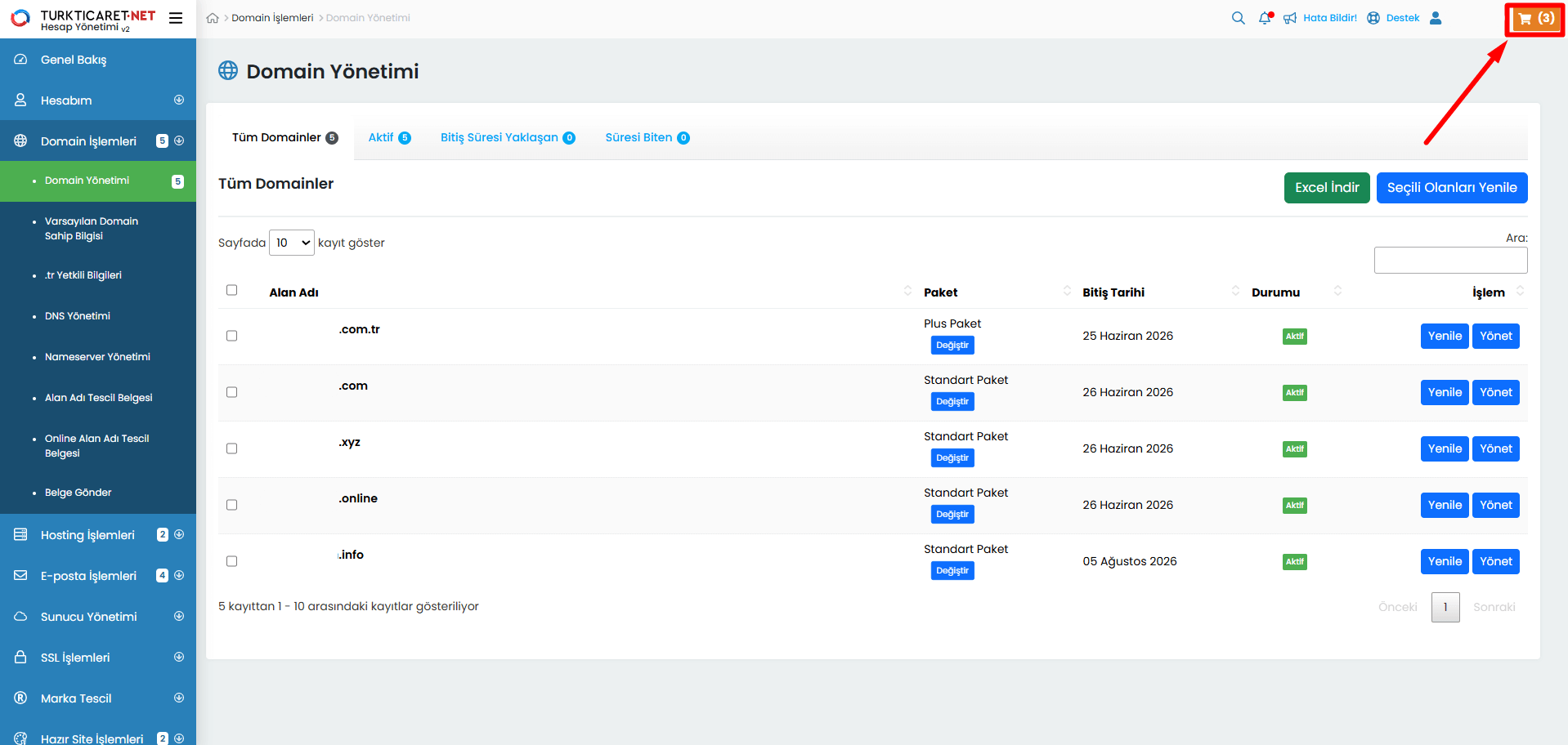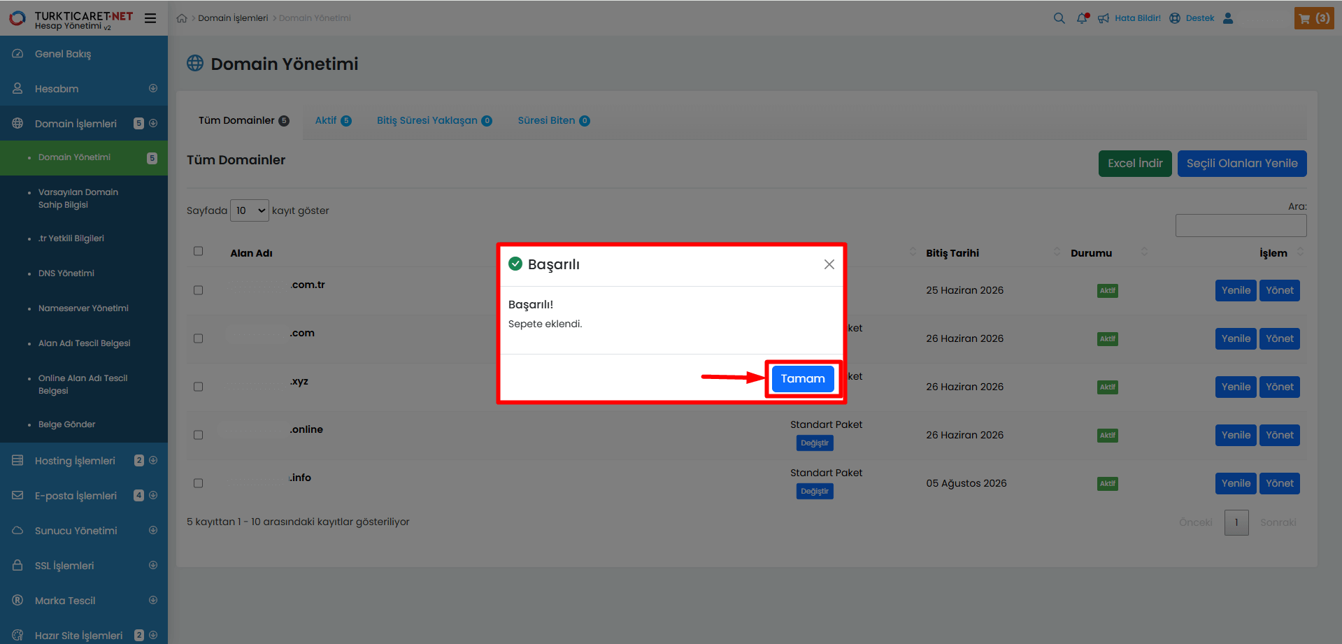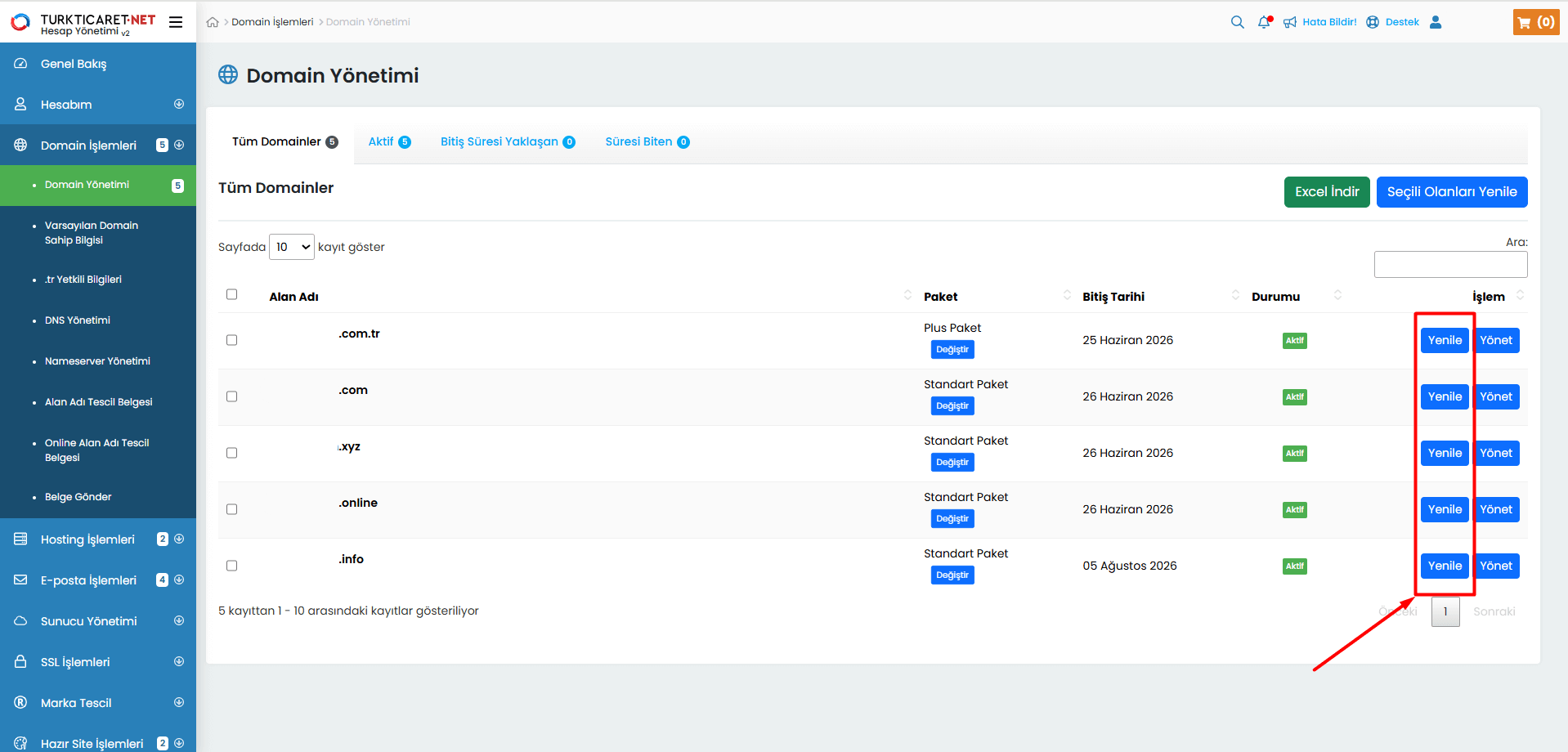 Turkticaret.Net paneliniz üzerinden alan adınızla ilgili yenileme, transfer, DNS yönetimi ve diğer işlemleri gerçekleştirebileceğiniz, aynı zamanda bu konularla ilgili detaylı bilgilere ulaşabileceğiniz alandır.