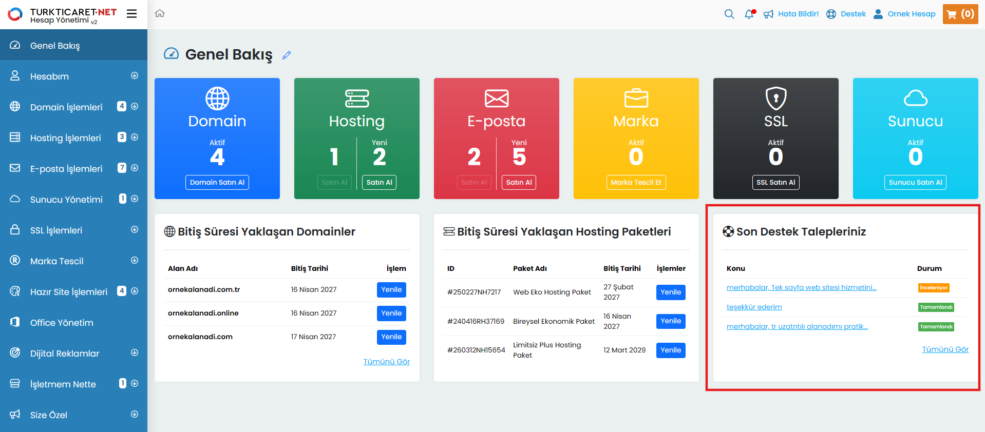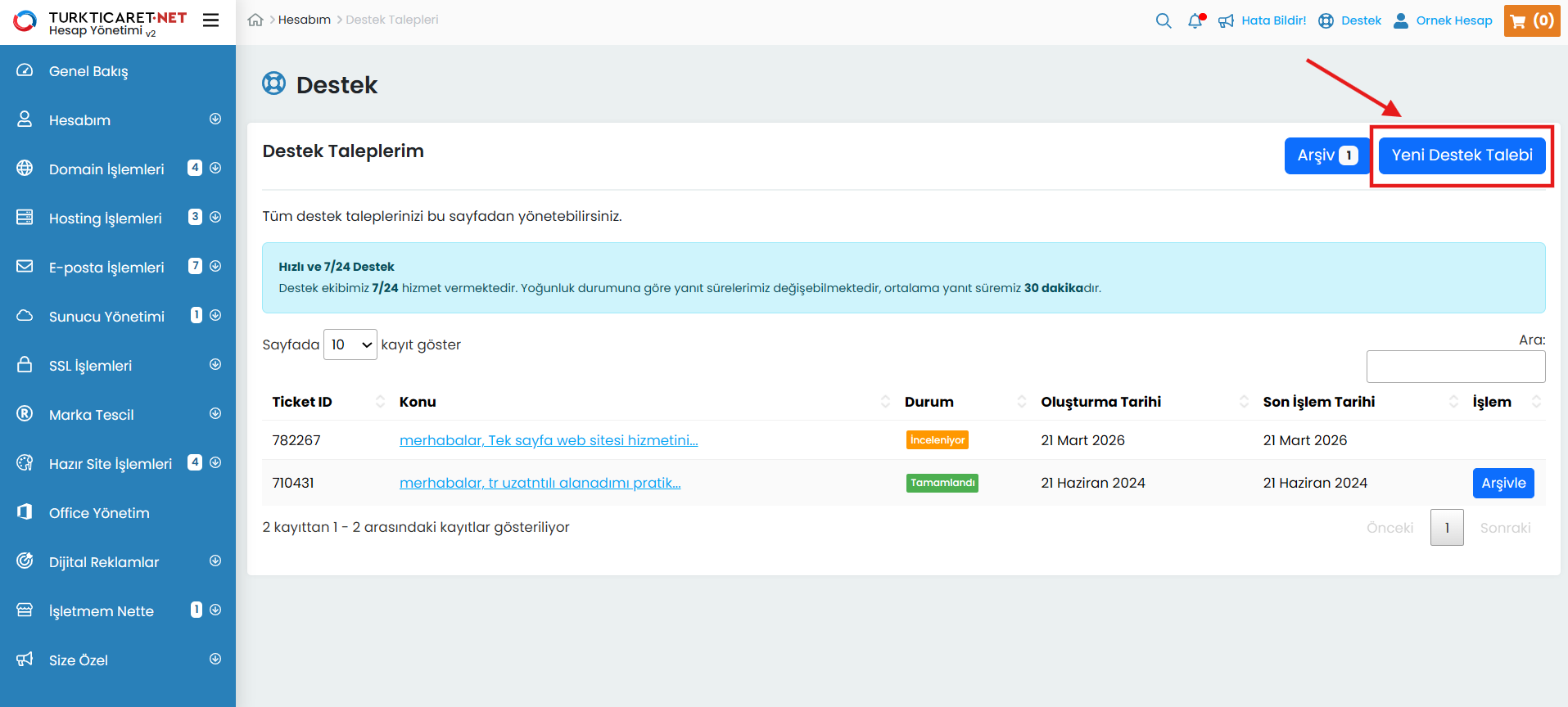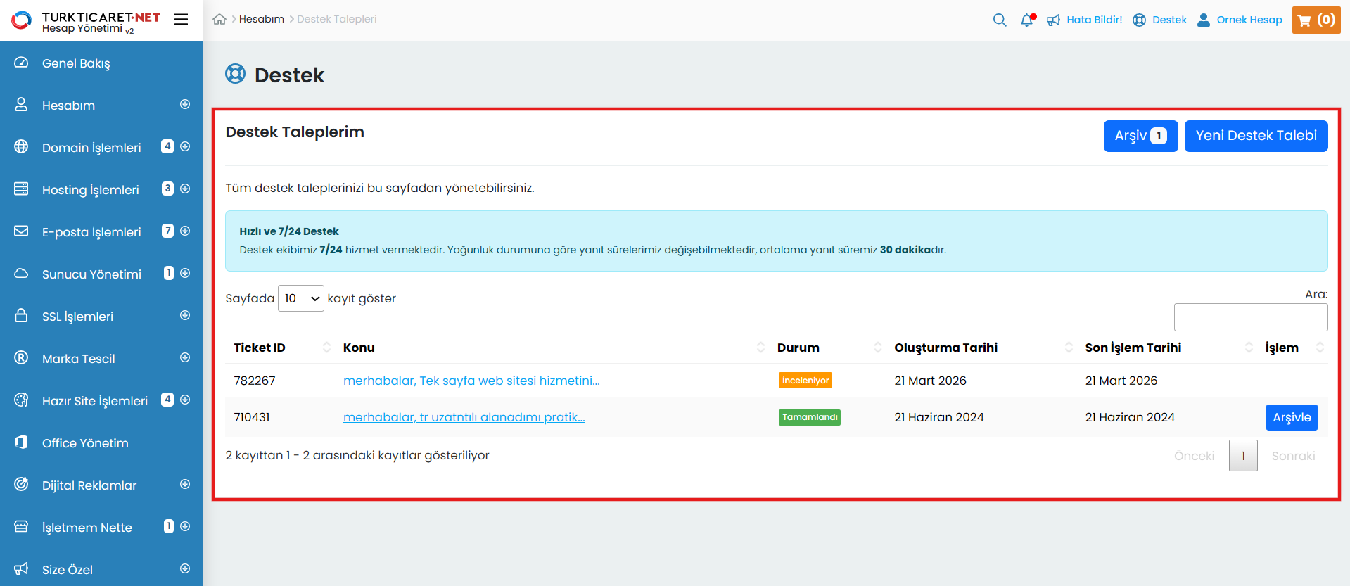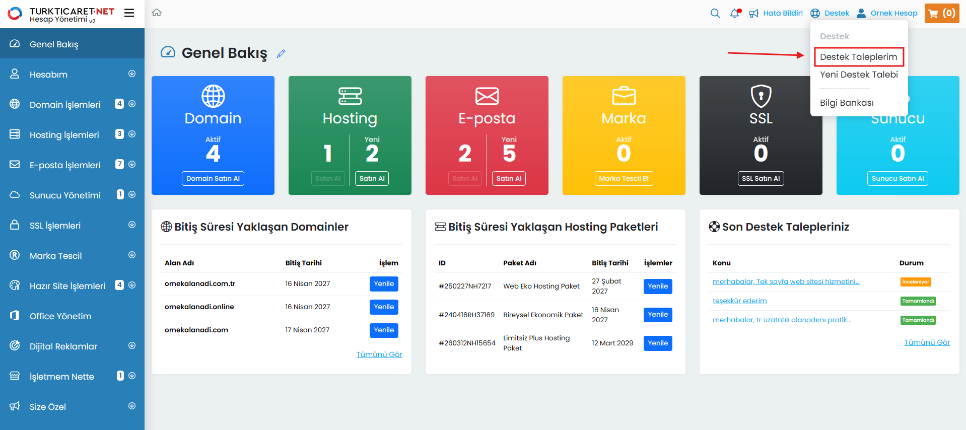 Destek talebi, Turkticaret.Net üzerinden aldığınız ürün ve hizmetlere ilişkin sorularınızı iletebileceğiniz ve yanıt alabileceğiniz bir haberleşme sistemidir. Destek talepleriniz, müşteri temsilcilerimiz tarafından incelenerek yanıtlandıkça sistem üzerinden size bildirilir ve tüm yazışmalar tek bir ekran üzerinden düzenli şekilde sunulur. Oluşturduğunuz destek taleplerini kolayca görüntüleyebilir, güncel durumlarını takip edebilir ve taleplerinizi yönetebilirsiniz.
