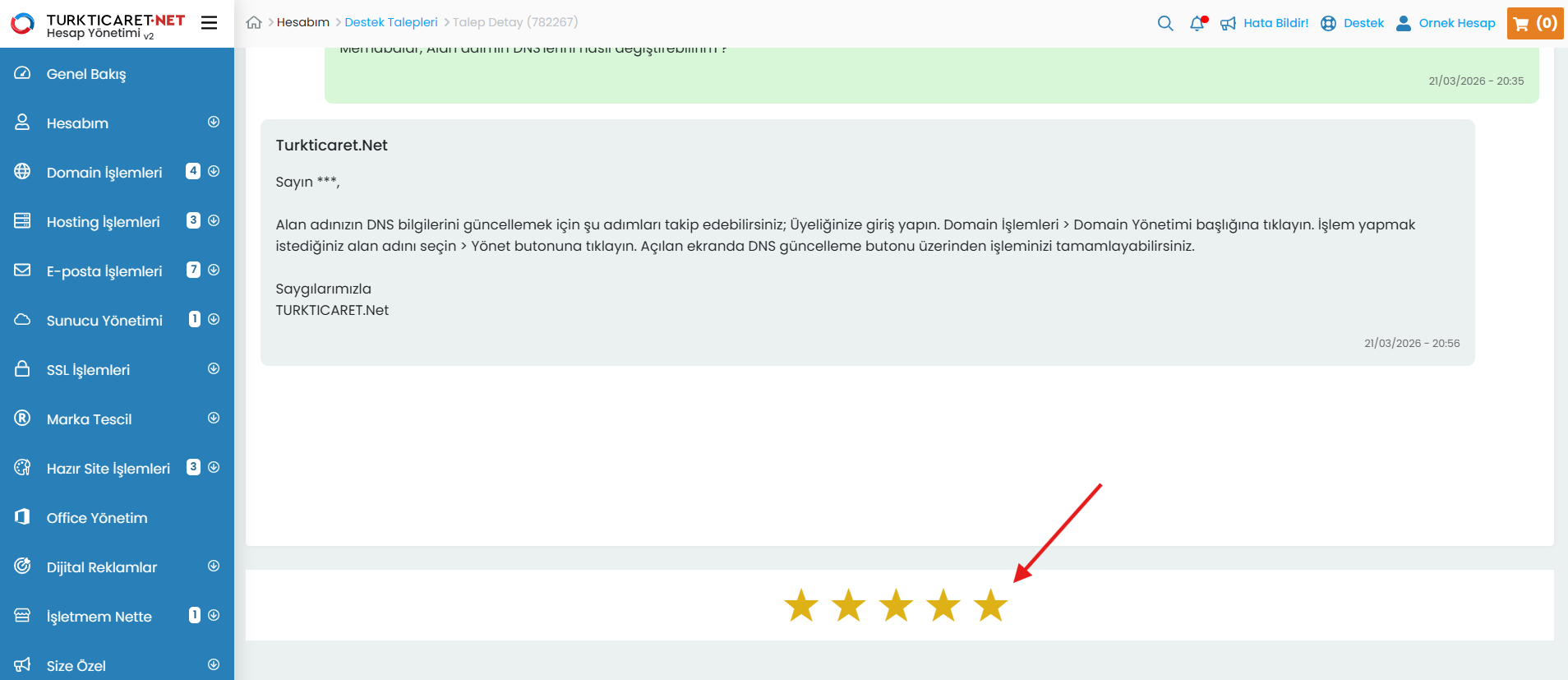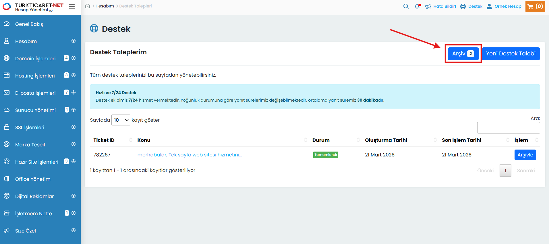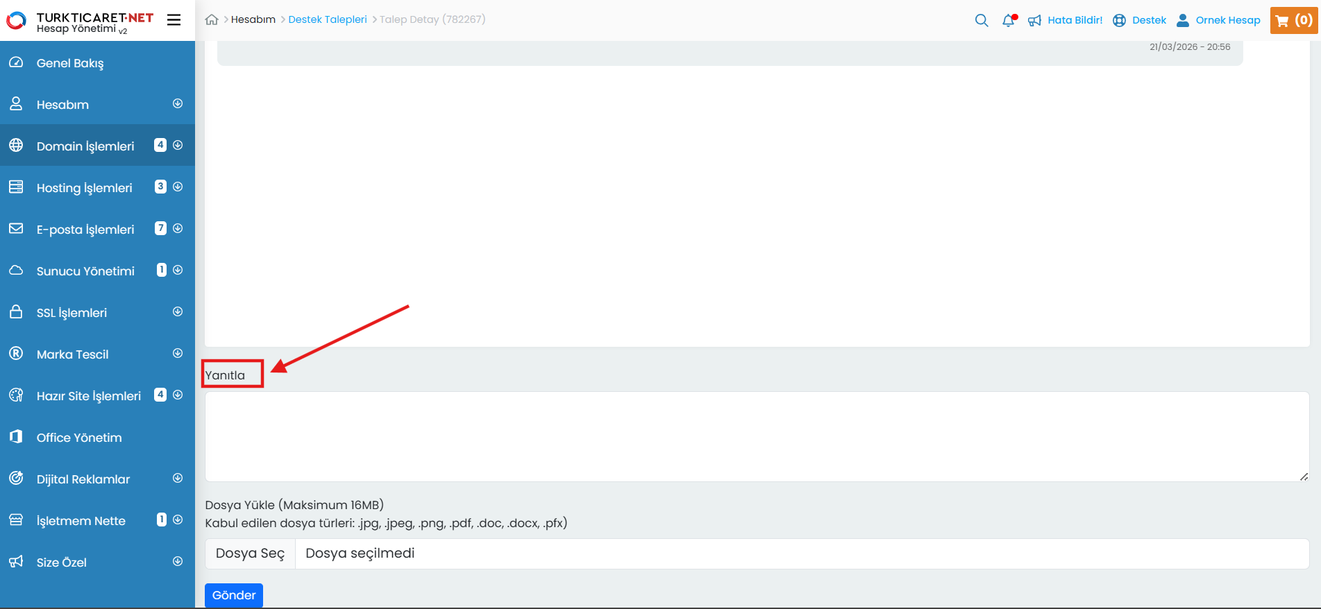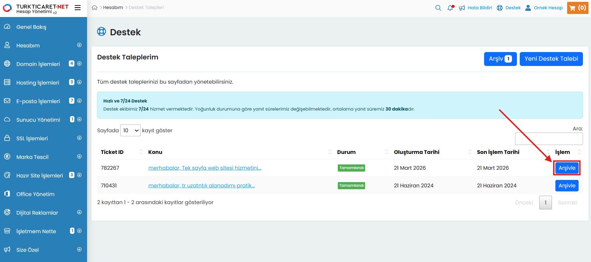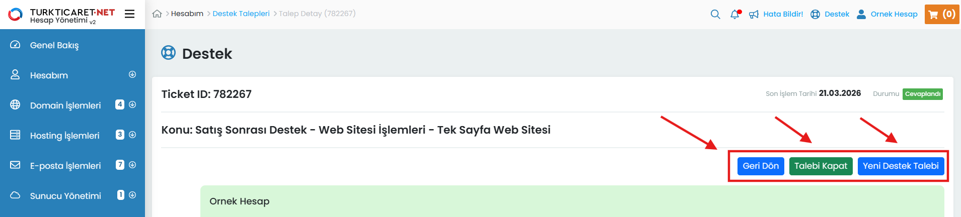 Destek talebi, Turkticaret.Net üzerinden aldığınız ürün ve hizmetlere ilişkin sorularınızı iletebileceğiniz ve yanıt alabileceğiniz bir haberleşme sistemidir. Destek talepleriniz, müşteri temsilcilerimiz tarafından incelenerek yanıtlandıkça sistem üzerinden size bildirilir ve tüm yazışmalar tek bir ekran üzerinden düzenli şekilde sunulur. Oluşturduğunuz destek taleplerini kolayca görüntüleyebilir, güncel durumlarını takip edebilir ve taleplerinizi yönetebilirsiniz.