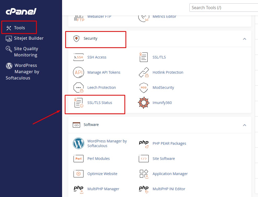 2. “Tools”  ana sayfasında “Security” başlığı altında bulunan“SSL/TLS Status” butonuna tıklayın.
