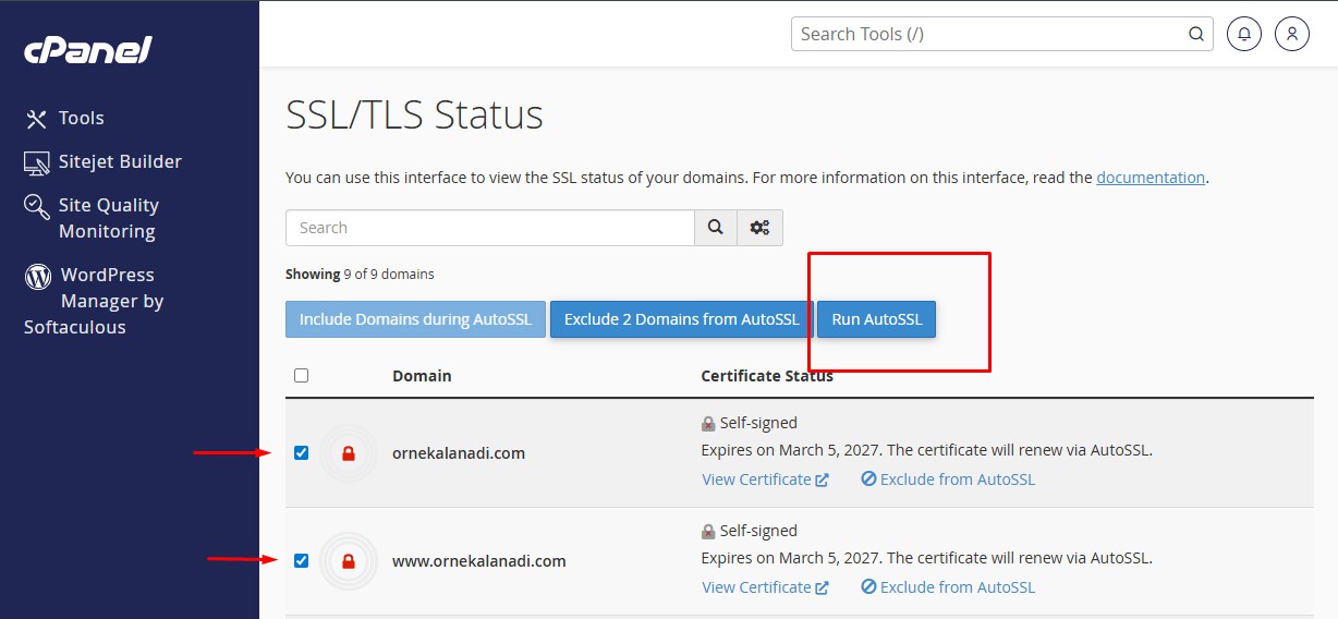 3. Açılan sayfada alan adınızı ve www.alanadınız seçeneklerini seçip “Run AutoSSL” butonuna tıklayın.