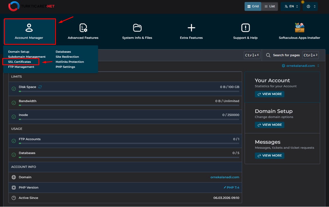 2. “Account Manager” başlığı altında bulunan “SSL Certificates” başlığına tıklayın.