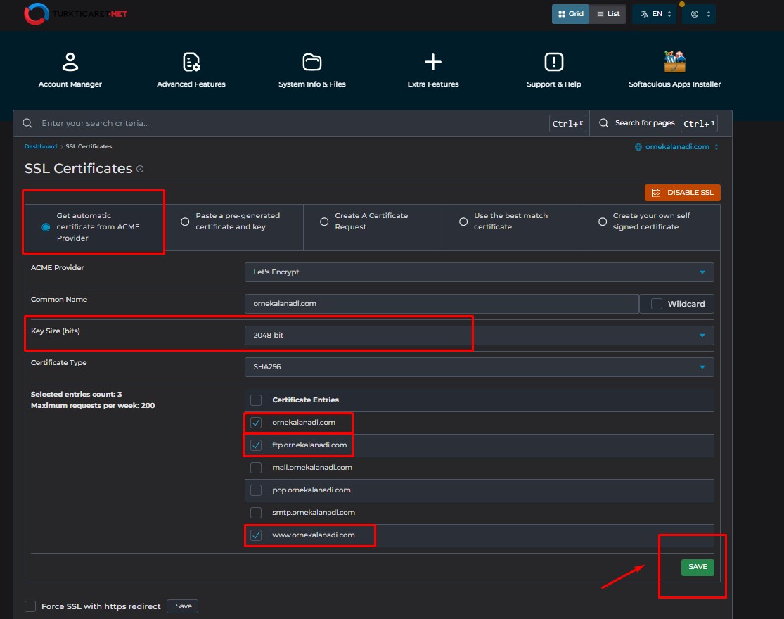 3. Açılan sayfada  “Get automatic certificate from ACME Provider” seçeneğini seçin. Key Size seçeneğini 2048-bit olarak düzenleyin. Selected entries count kısmında görseldeki gibi alan adınız, ftp.alanadınız ve www.alanadınız seçeneklerini seçin ve “Save” butonuna tıklayın.