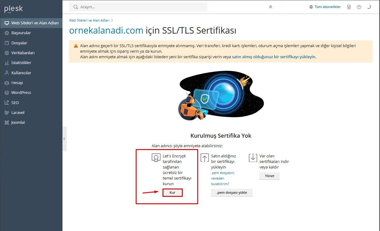 4. Açılan sayfada “Let’s Encrypt tarafından sağlanan ücretsiz bir temel sertifikayı kurun” açıklaması altında bulunan “Kur” butonuna tıklayın.