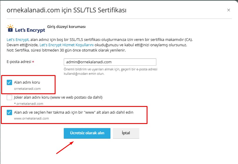 5. Açılan sayfada “E-posta adresi” kutucuğunda yazan mail adresinizin doğru ve ulaşılabilir bir mail hesabı olduğunu teyit edin. Doğru değilse düzenleyebilirsiniz. Aşağıdaki seçeneklerden “Alan adını koru” ve “Alan adı ve seçilen her takma adı için bir ‘www’ alt alan adı dahil edin” kutucuklarını işaretleyin ve “Ücretsiz olarak alın” butonuna tıklayın.