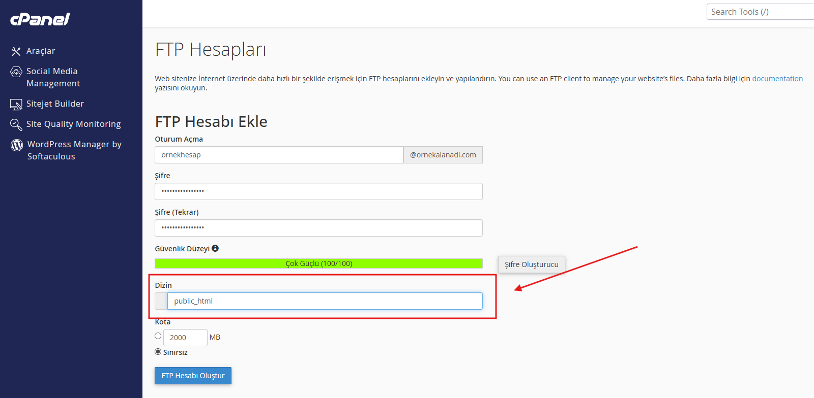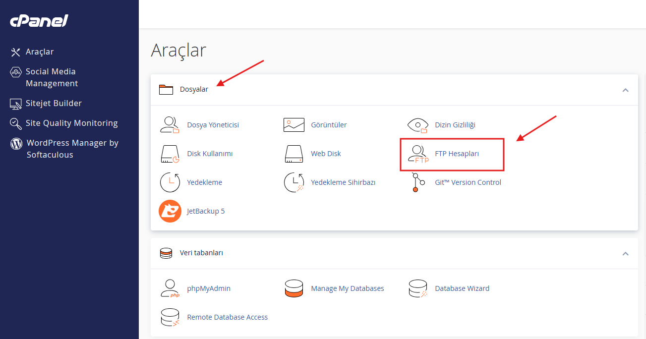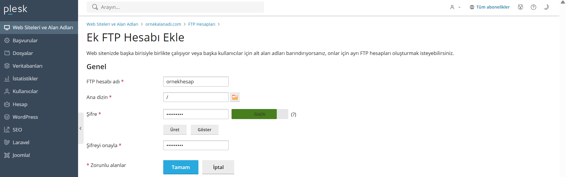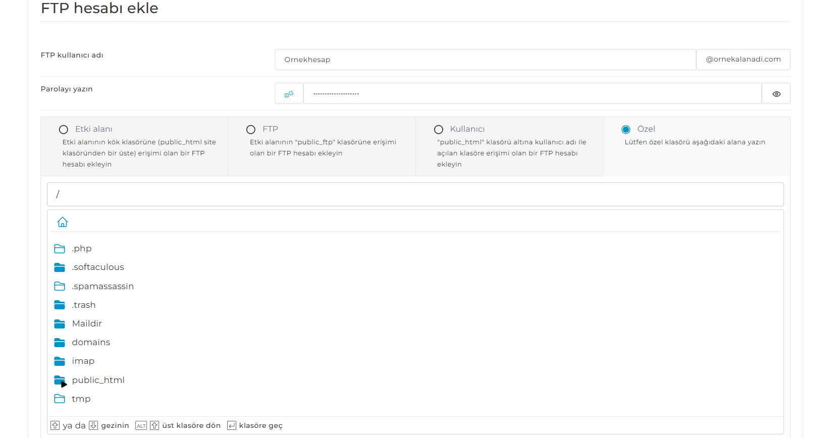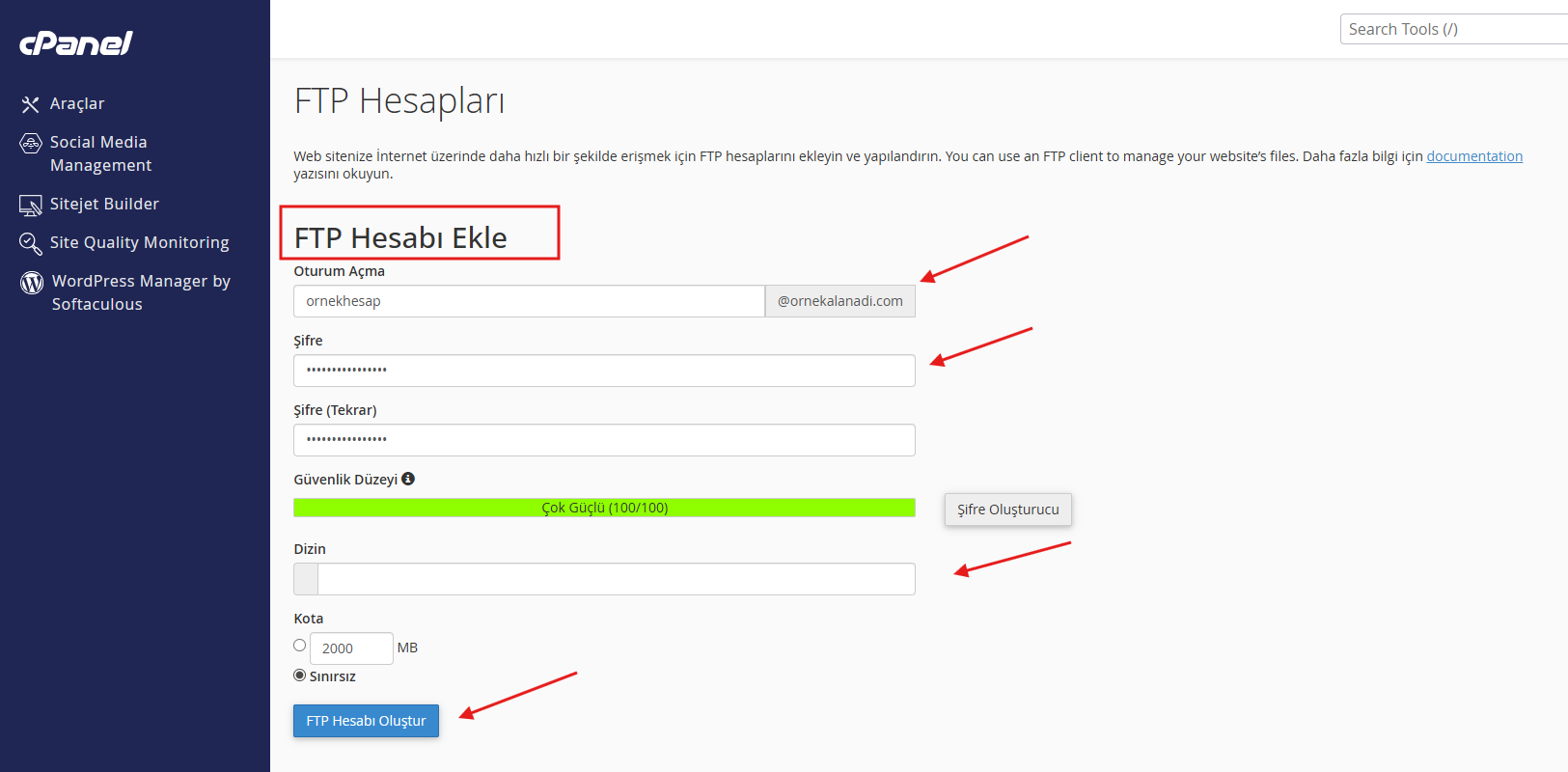FTP hesabı oluşturma işlemi, cpanel, plesk veya DirectAdmin gibi kullandığınız hosting panelinizde bulunan ilgili modül üzerinden gerçekleştirilebilir.