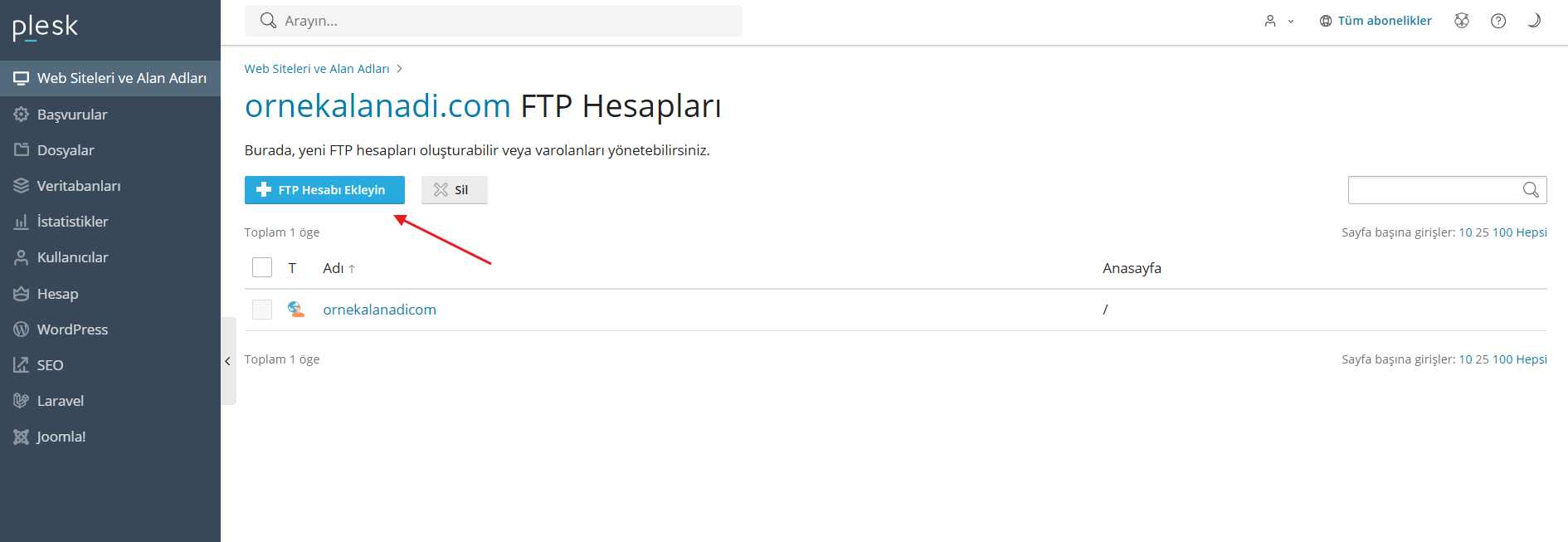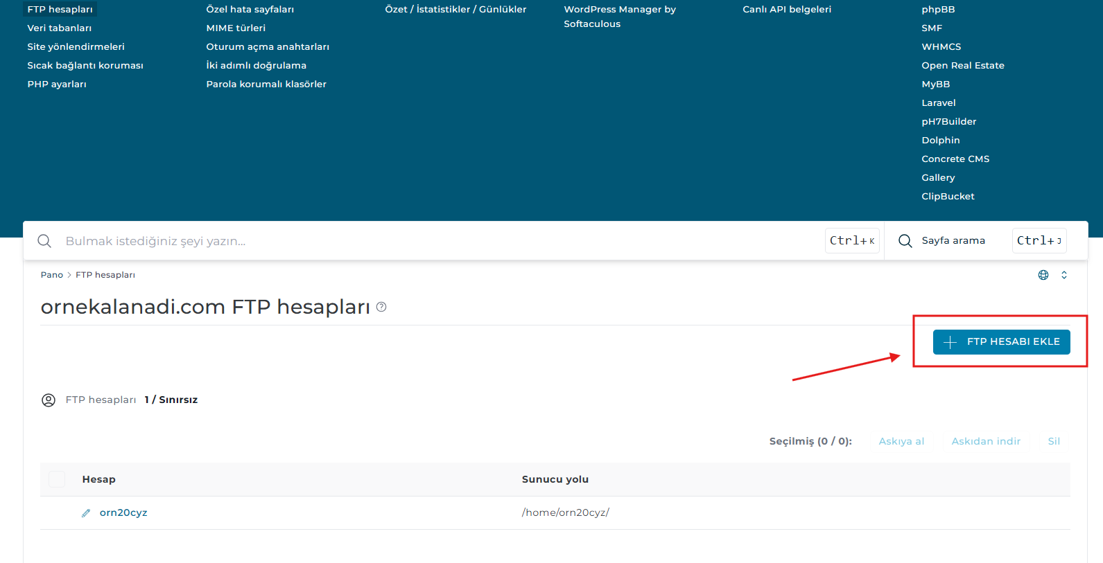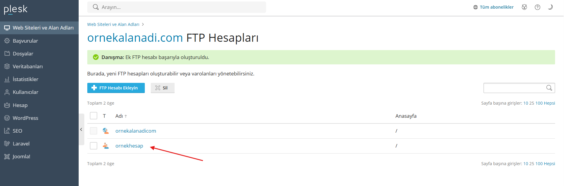 FTP hesabınızı oluşturduktan sonra sayfanın alt kısmında bulunan “FTP Hesapları” başlığı altında oluşturduğunuz hesabı görüntüleyebilirsiniz.