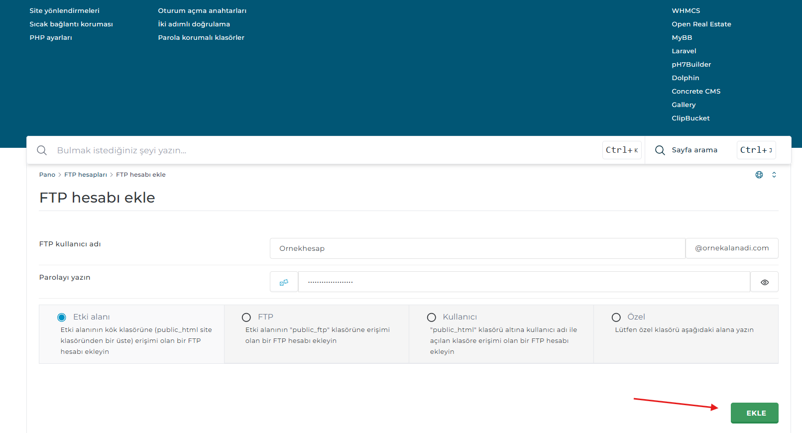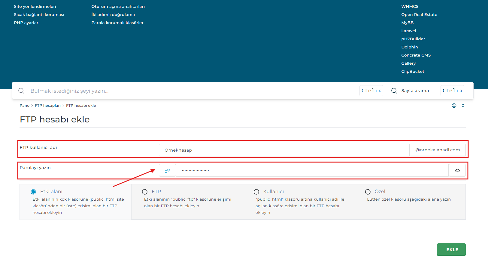 Hosting panel türüne göre değişiklik gösteren FTP hesabı oluşturma aşamaları aşağıdaki gibidir;