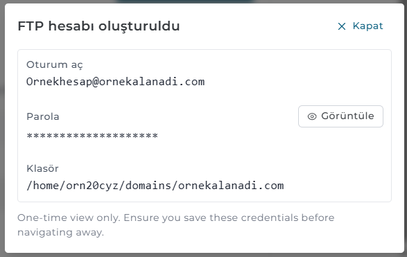 FTP Hesabınız oluşturulduktan sonra oluşturduğunuz FTP hesabına ait bilgiler görüntülenir. Bu bilgiler ile FTP hesabınıza erişim sağlayabilirsiniz.