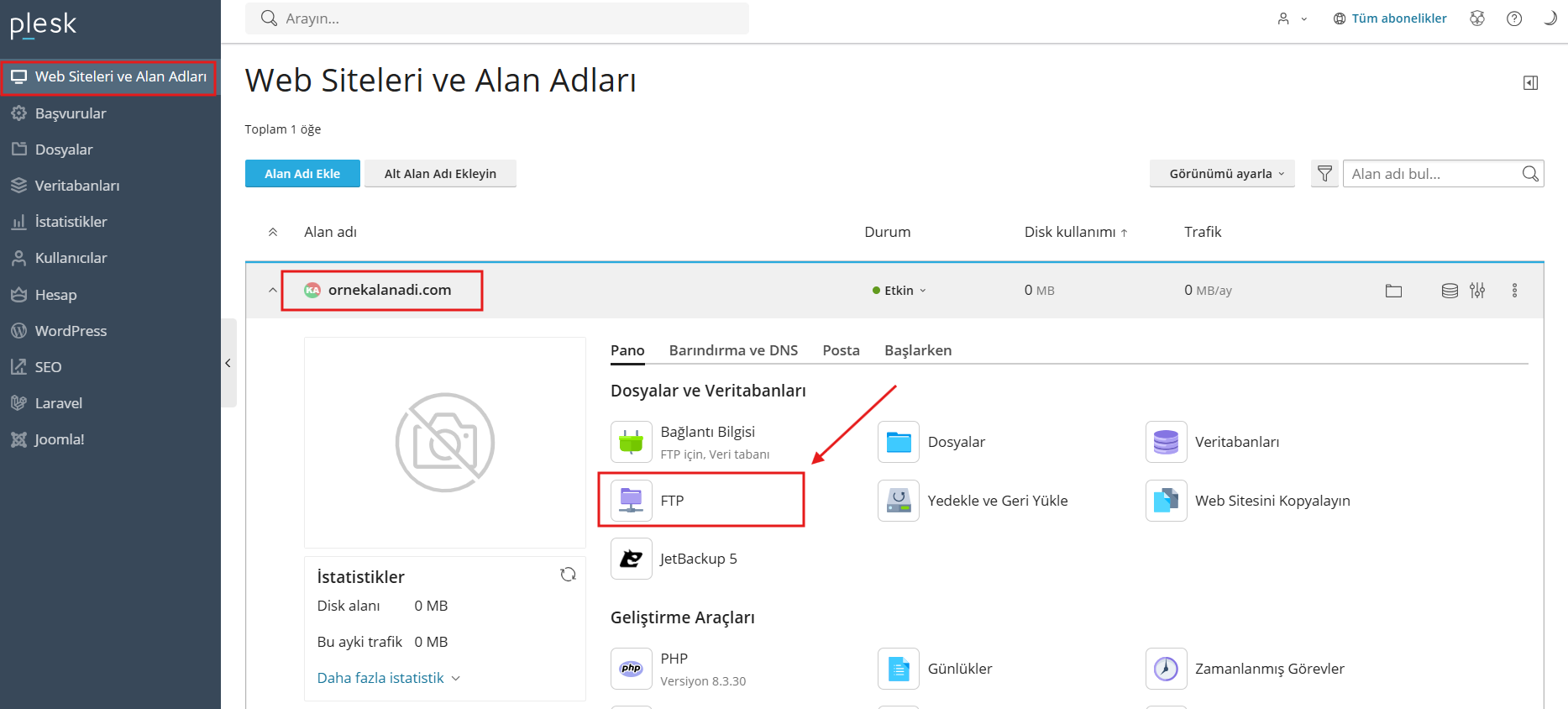 Plesk panele giriş sonrasında FTP modülü ile FTP hesabı ekleyebilir mevcut hesaplar ile ilgili güncelleme ve silme işlemleri gerçekleştirilebilir.