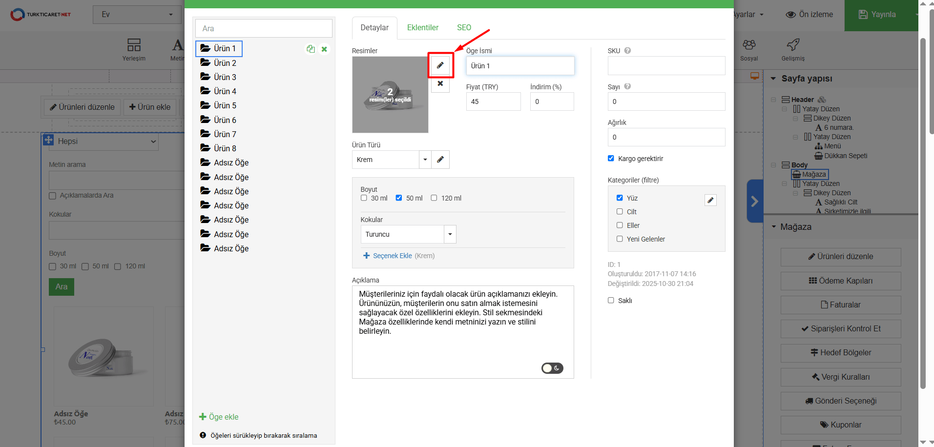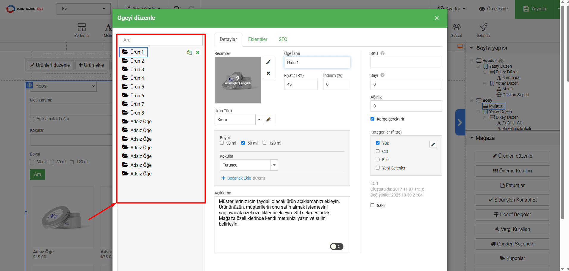 - E-ticaret şablonunun üzerine tıkladığınız zaman sayfanın sağ tarafında “Ürünleri Düzenle” butonunu göreceksiniz, butona tıklayın.