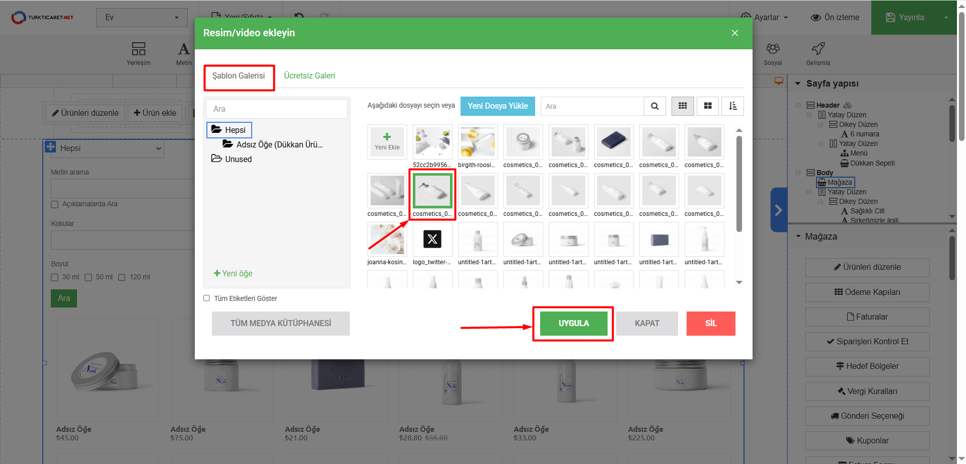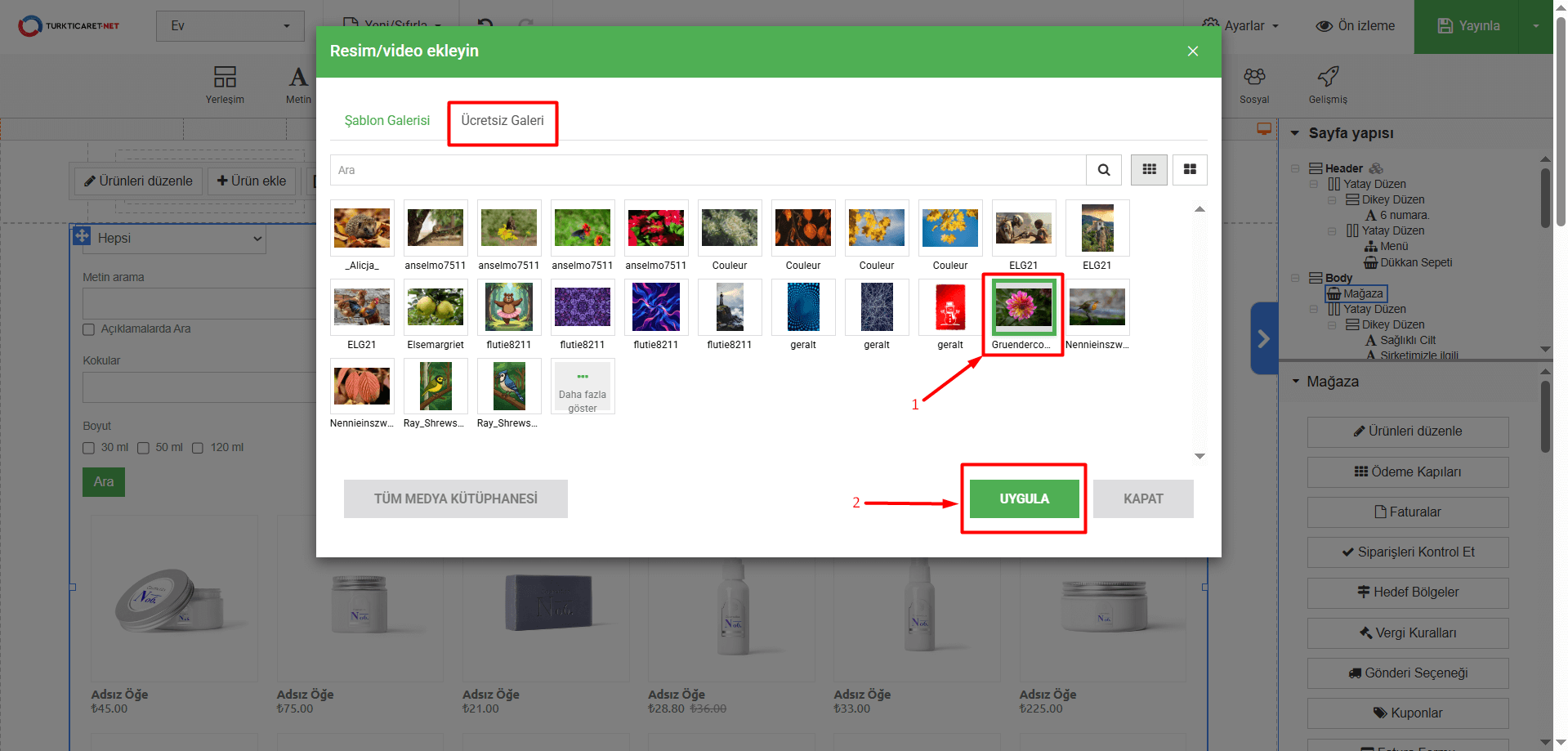 - “Ücretsiz Galeri” bölümünde ise şablon içinde gelen ücretsiz kullanabileceğiniz görselleri görüntüleyebilirsiniz. Ürüne ekleyeceğiniz bir görsel varsa üzerine basarak seçim yapın ve “Uygula” butonuna tıklayın.