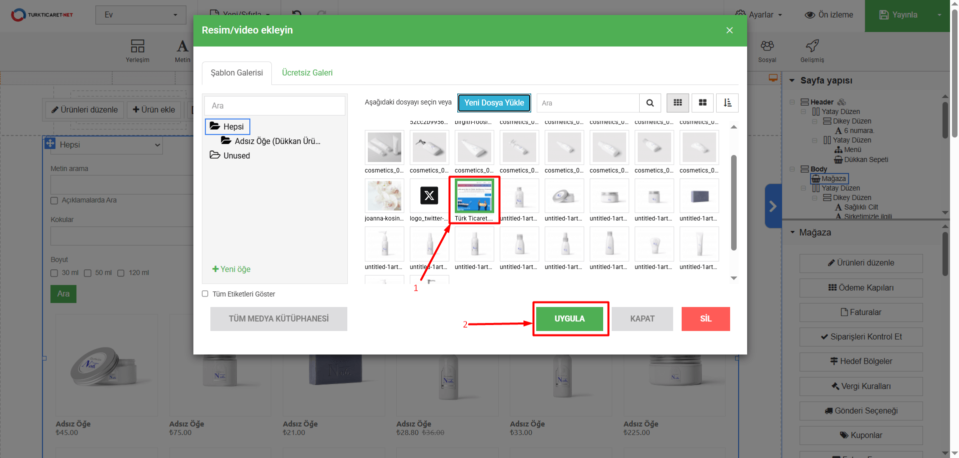 - “+ Yeni Ekle” butonuna tıkladığınız zaman “Şablon Galerisi” ile karşılaşacaksınız. Bu bölümde daha önce yüklediğiniz veya e-ticaret ögesi ile birlikte gelen görselleri görebilirsiniz. Ürüne ekleyeceğiniz bir görsel varsa üzerine basarak seçim yapın ve “Uygula” butonuna tıklayın.