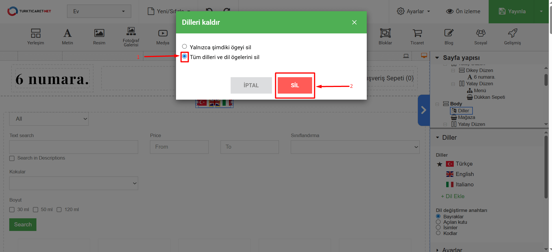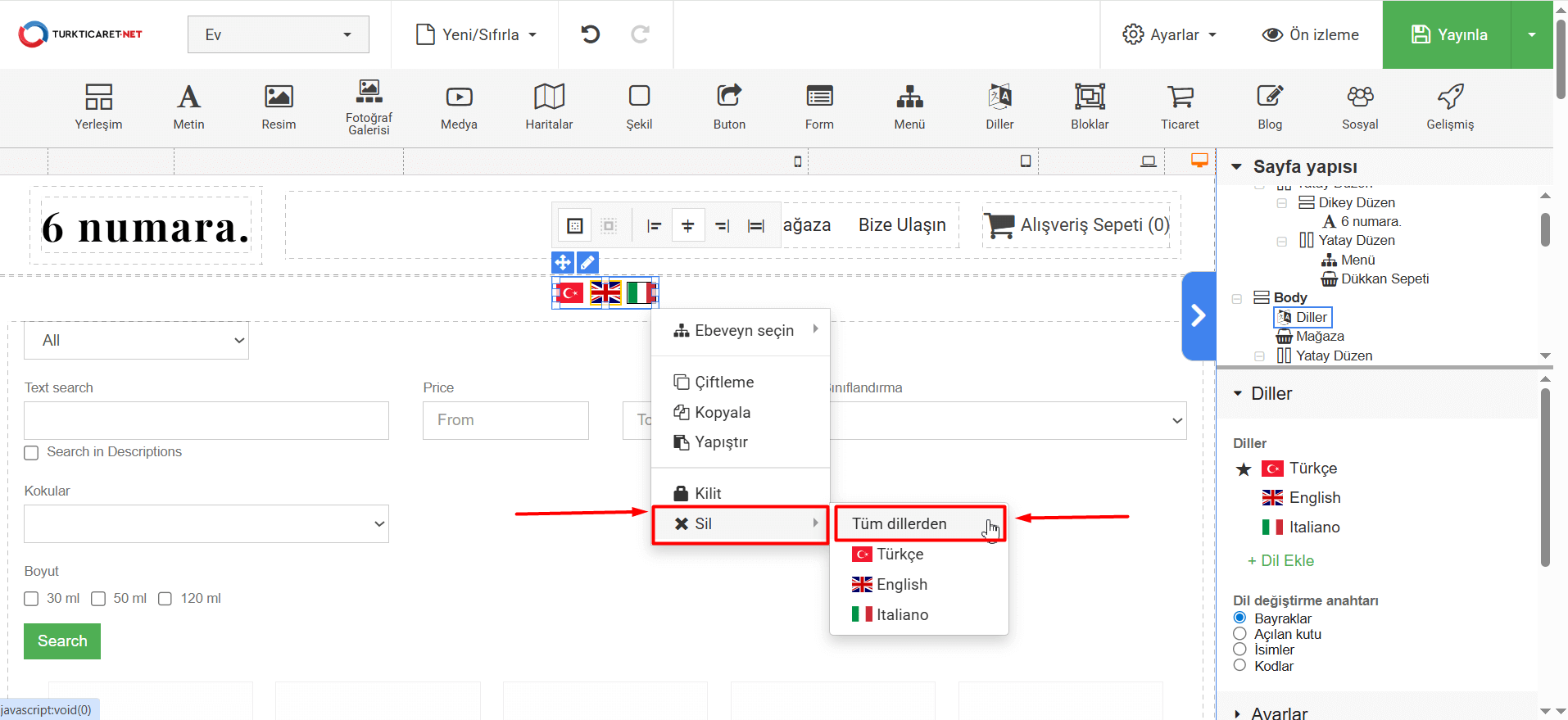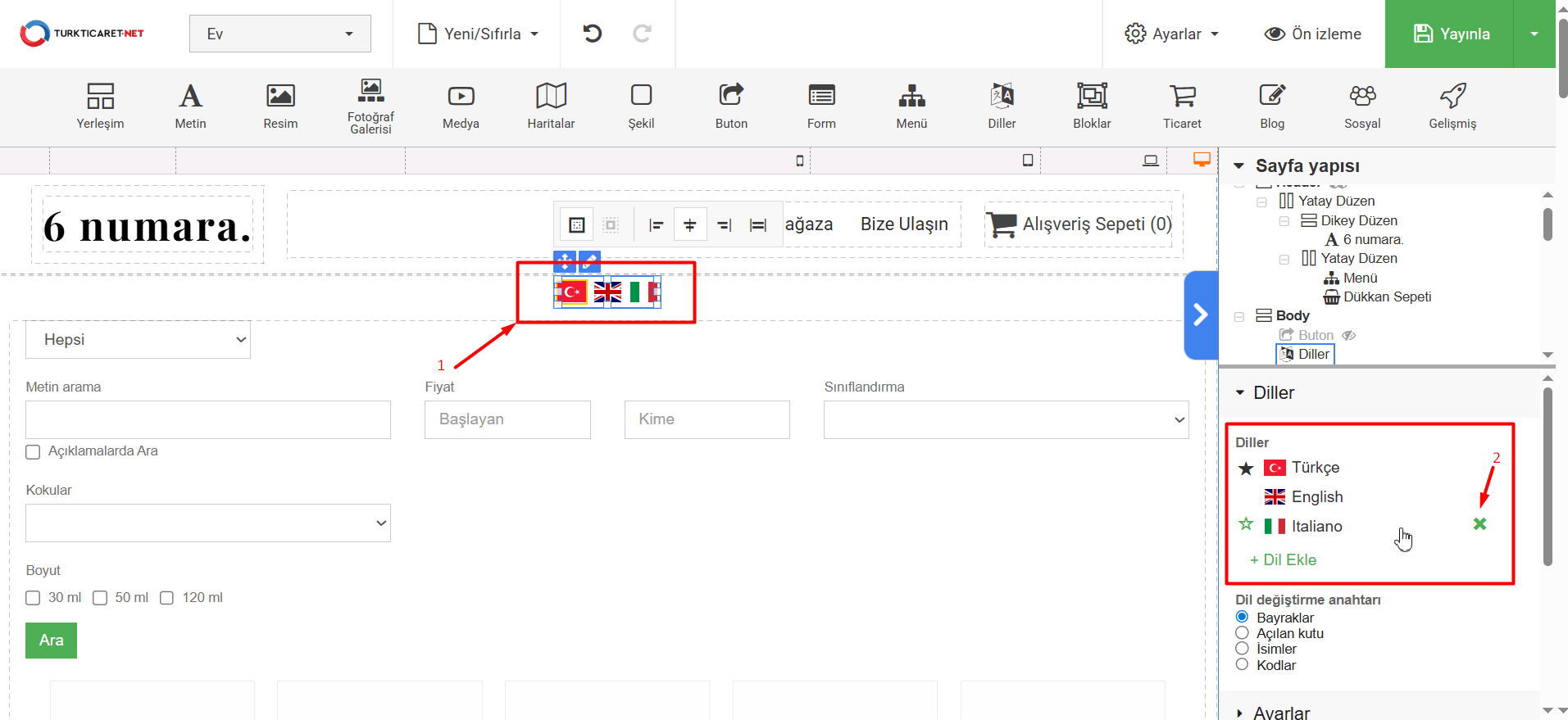Not: Web sitenizdeki ögelerin çeviri alanları, ögenin türüne göre farklılık gösterebilir. Örneğin, bir buton üzerindeki yazıyı çevirmek istiyorsanız, butona bir kez tıklayın. Sayfanın sağ tarafında bulunan bölümde “Metin” alanı görünecektir. Bu alanda, seçtiğiniz dillere ait bir açılır liste bulunur. Her dilin yanında bir metin kutusu vardır. İlgili kutuya çeviriyi yazarak işlemi tamamlayabilirsiniz ve ardından listeyi kapatabilirsiniz. Panelde ögelerin çeviri alanları farklı yerlerde olsa da genel kullanım aynıdır. İlk olarak ögeye tıklanır, ardından dil bölümünden çeviri yapılır.