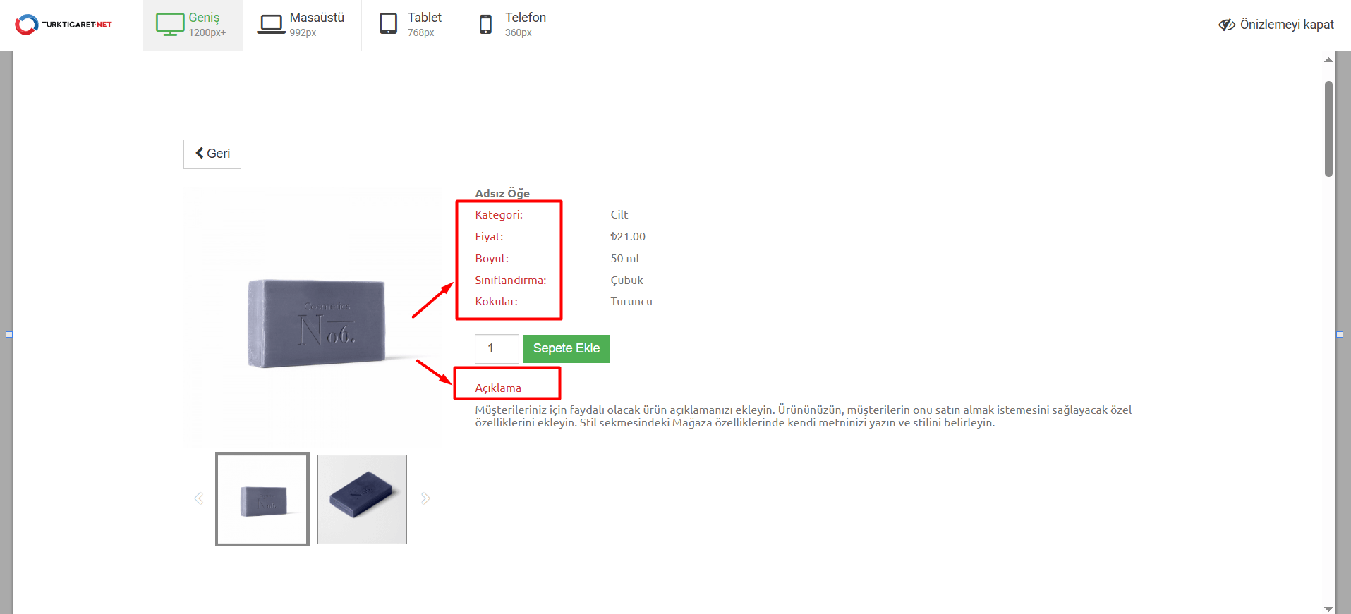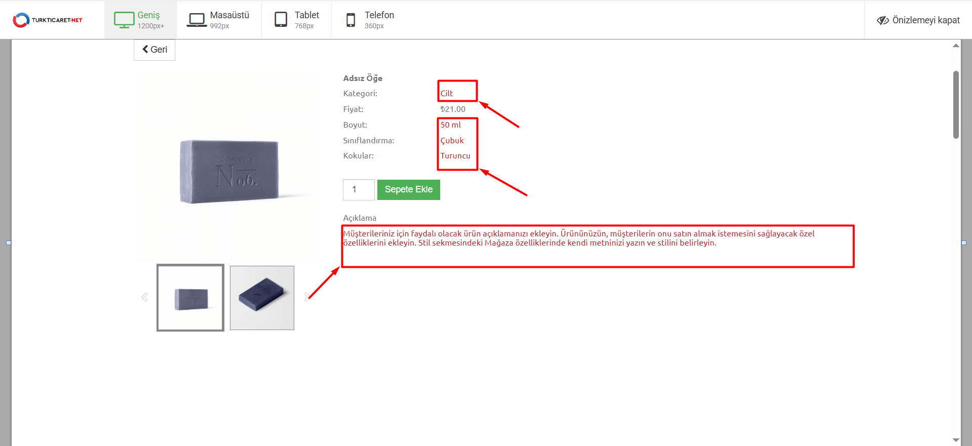 - “Açıklama” bölümünden ürün açıklamasına ait stil düzenlemesi yapabilirsiniz.