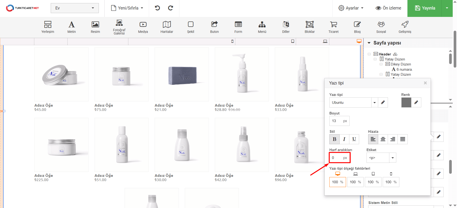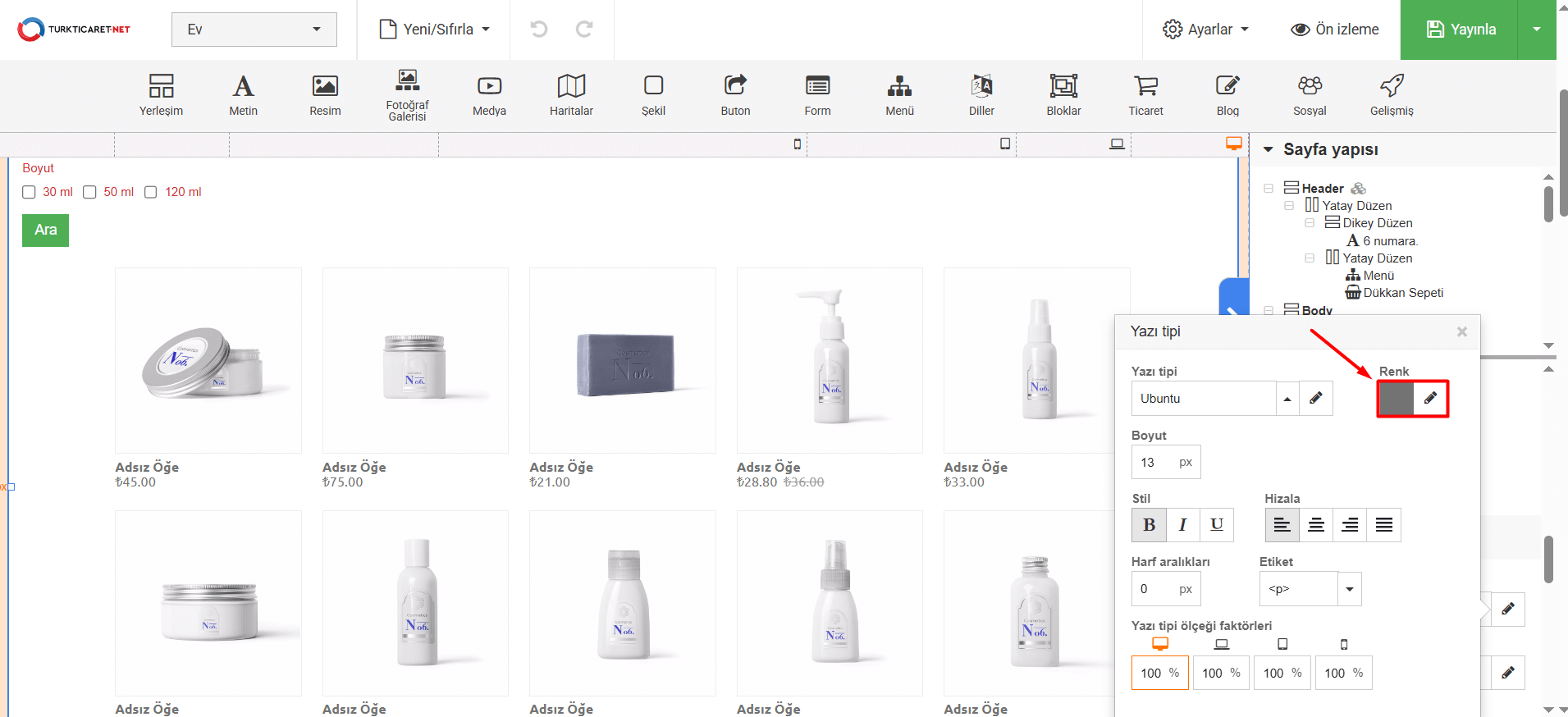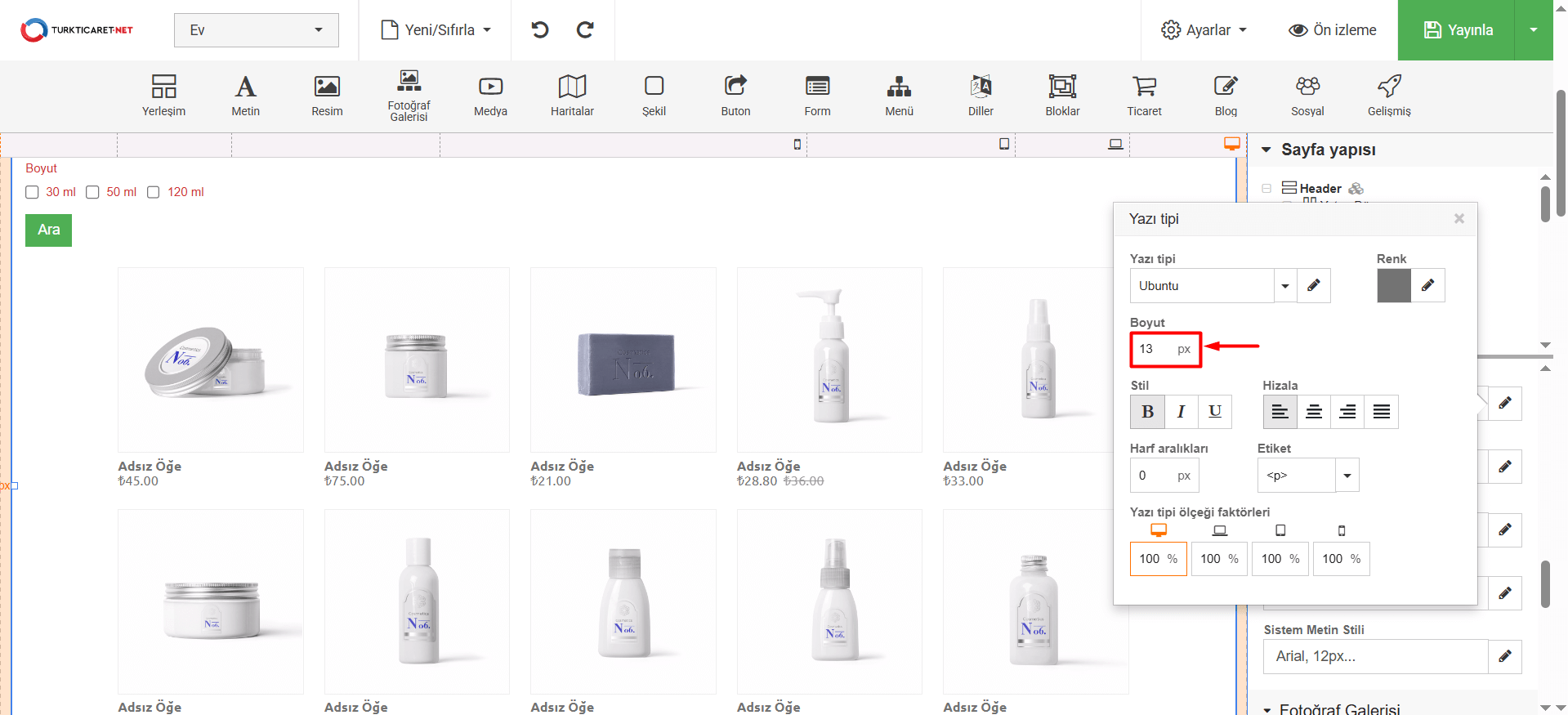 - “Sistem metin stili” bölümünde ise e-ticaret şablonunun ürün özellikleri dışında kalan bölümleri için stil düzenlemesi yapabilirsiniz.