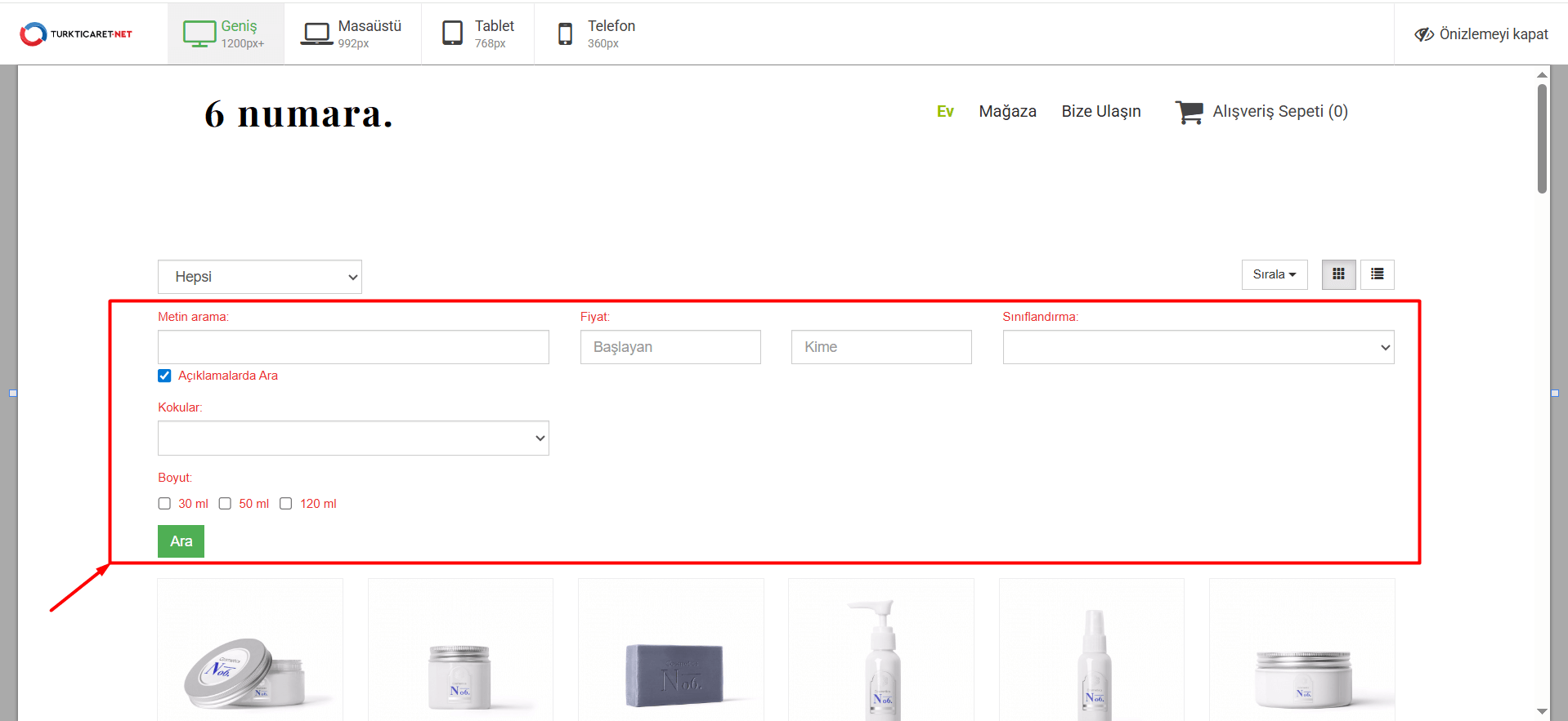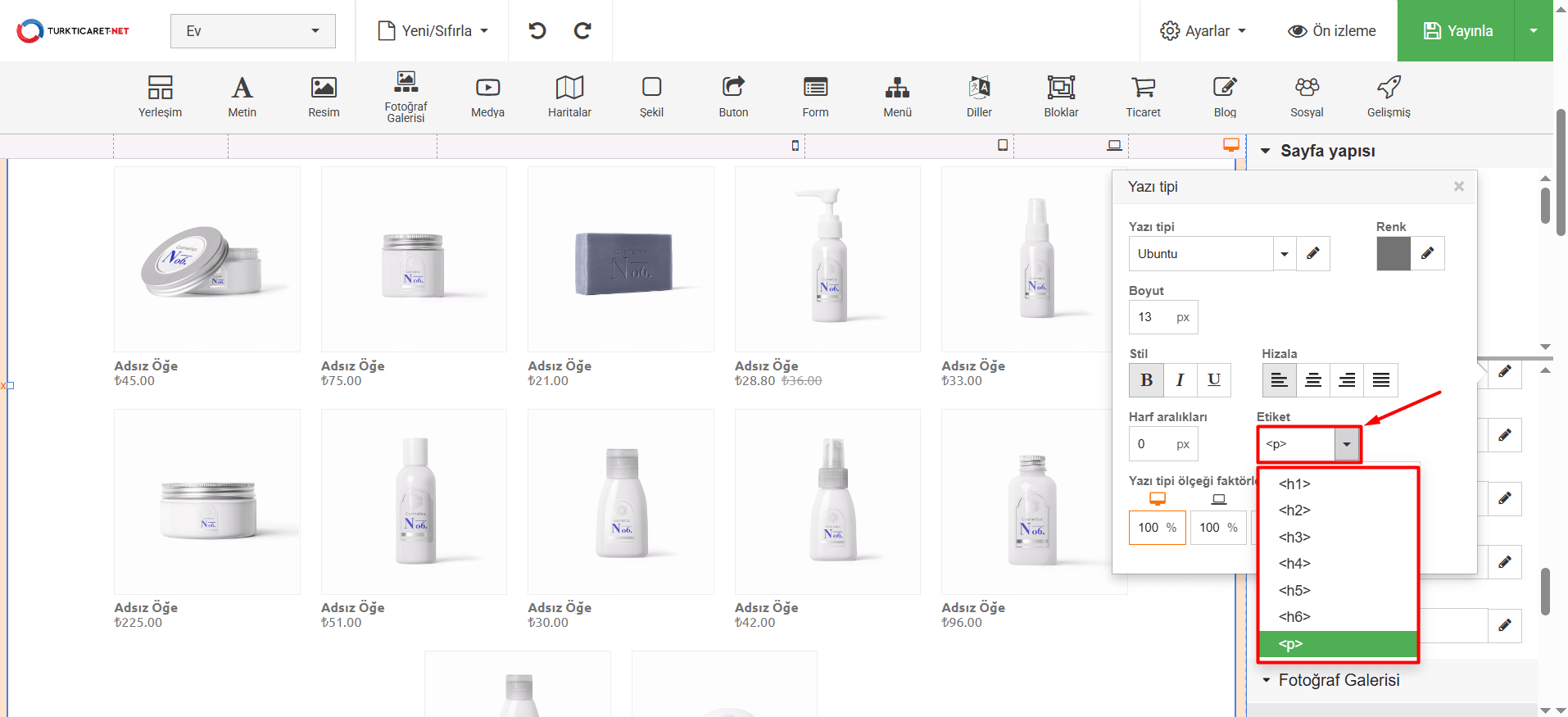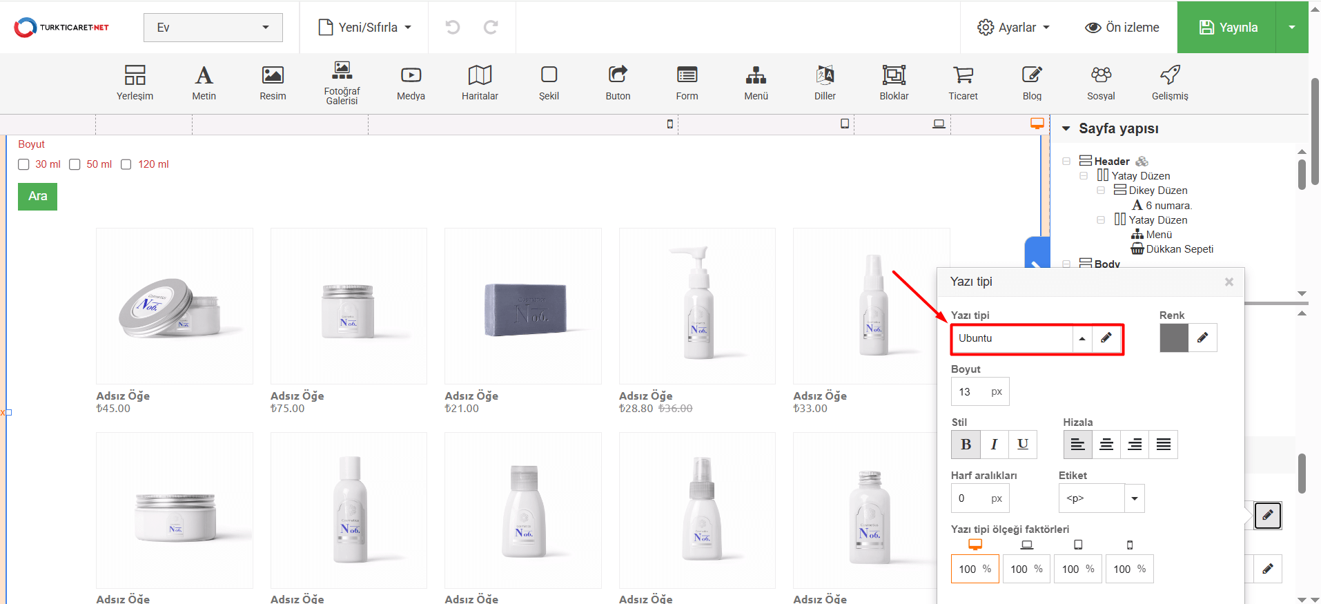 - “Sistem metin stili” bölümünde ise e-ticaret şablonunun ürün özellikleri dışında kalan bölümleri için stil düzenlemesi yapabilirsiniz.