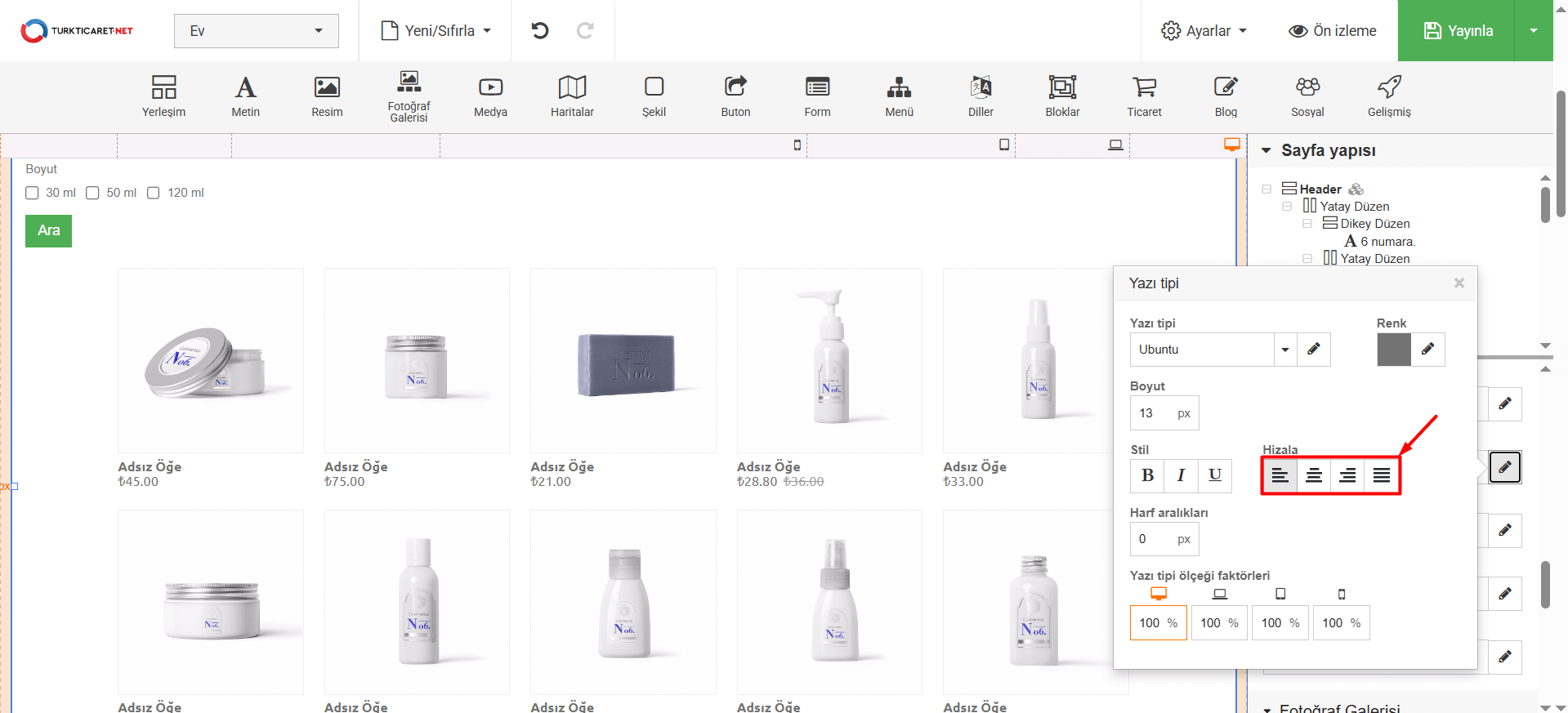 - Yazıları konumlandırmak için “Sola Dayalı“, “Ortada“, “Sağa Dayalı” veya “İki Kenara Yaslanmış” olarak yazıları “Hizala” bölümünden tercihinize göre seçebilirsiniz.