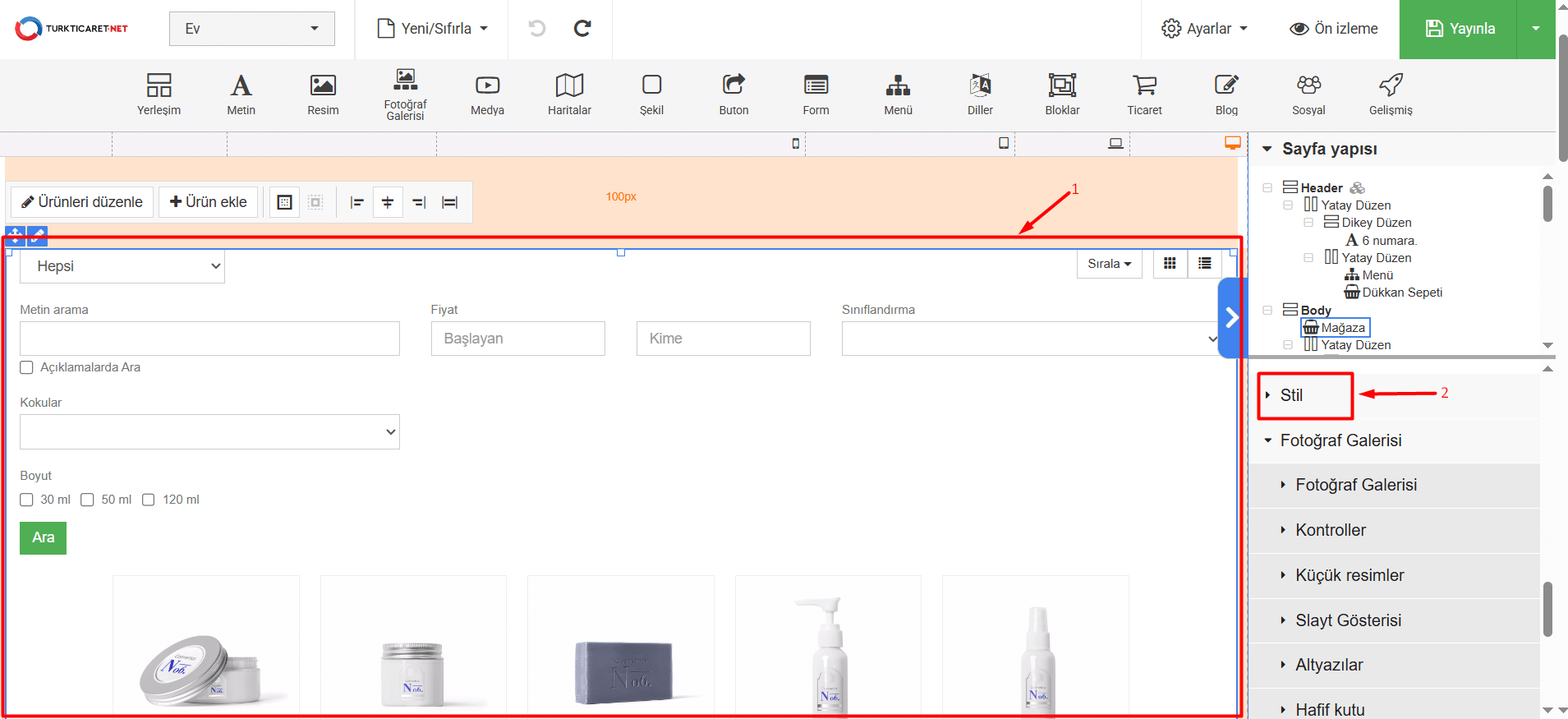 - E-ticaret şablonunun üzerine tıkladığınız zaman, sayfanın sağ tarafında “Stil” butonunu göreceksiniz, butona tıklayın.
