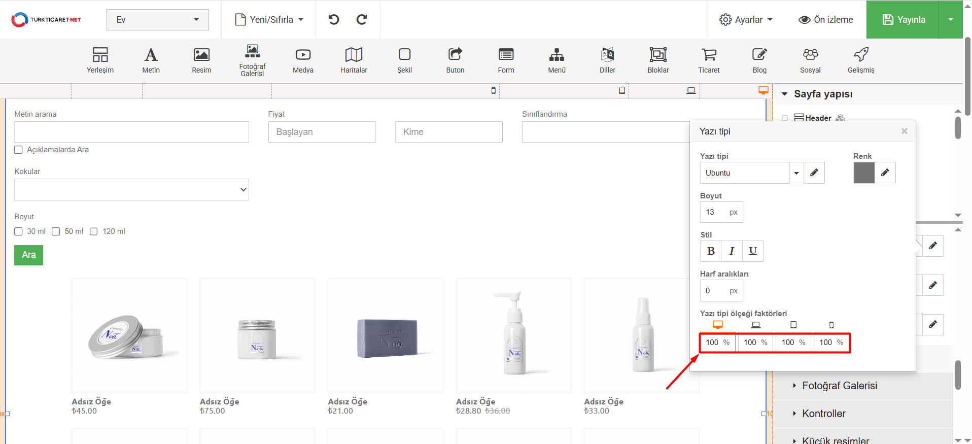 - Eğer yazının diğer cihazlardaki görüntüsüne göre ölçekte bir değişiklik yapmak istiyorsanız “Yazı tipi ölçeği faktörleri” bölümünü kullanarak, kutucuklara değer verebilirsiniz ve cihazlara göre canlı olarak kontrol edebilirsiniz. Bu konuda bilgiye ihtiyacınız varsa Hazır Site Şablonlarında Cihazlara Göre Sayfa Düzeni Nereden Kontrol Edilir? makalemize göz atabilirsiniz.