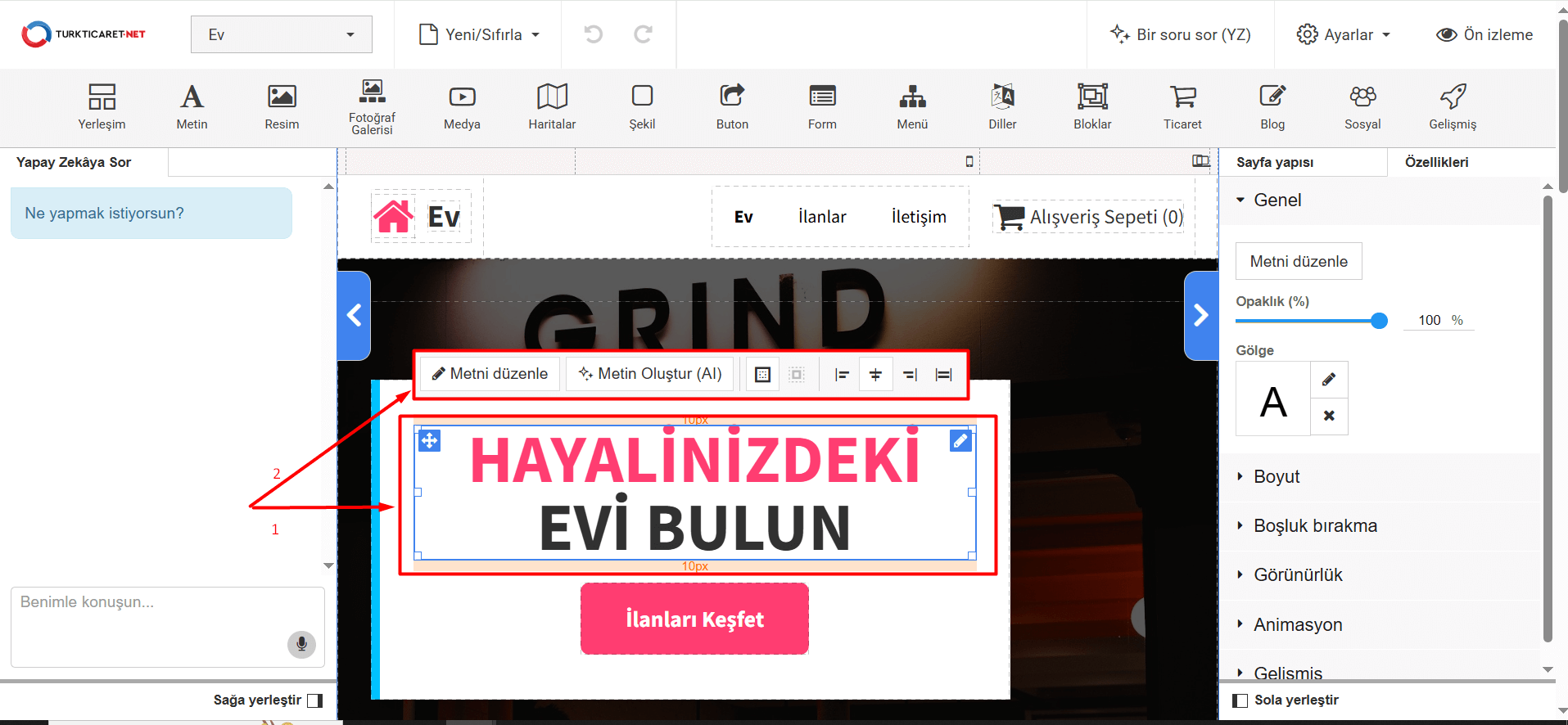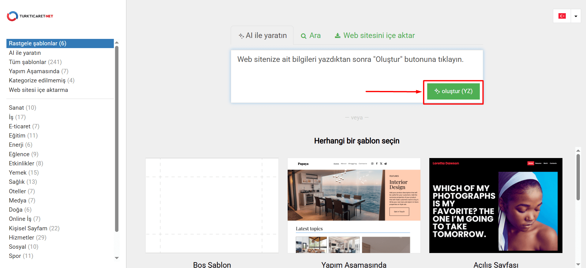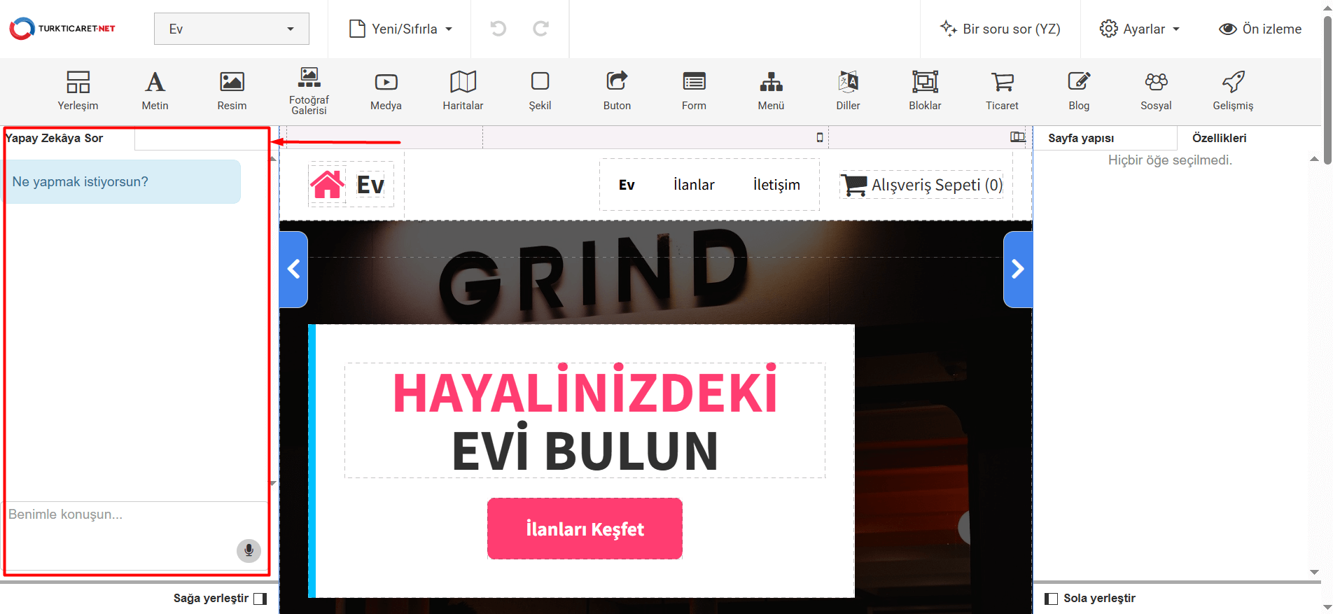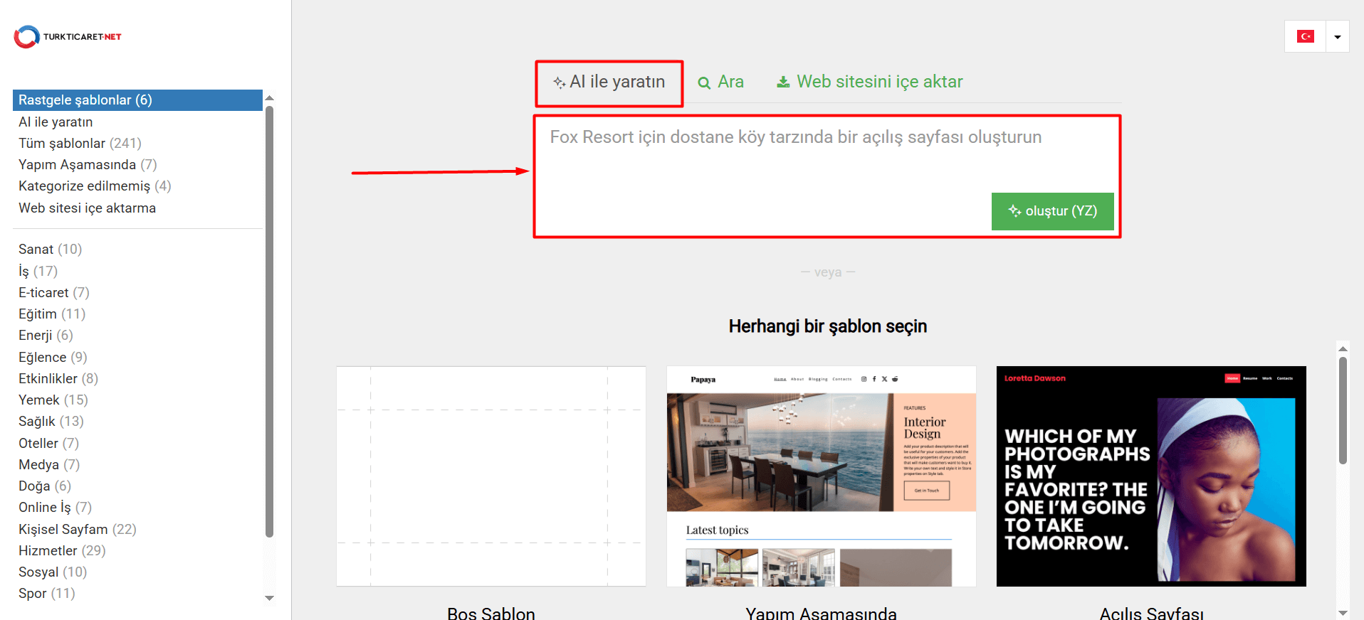 Önemli Bilgi: Yapay Zeka özelliğini yalnızca Hazır Site Business paketlerinde kullanabilirsiniz. Diğer web site ürünlerinde Yapay Zeka modülü bulunmamaktadır.