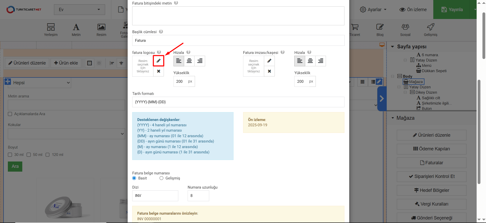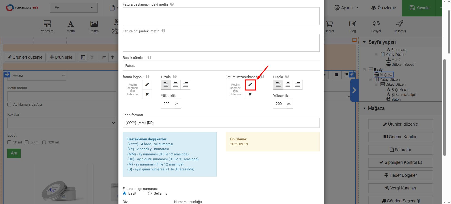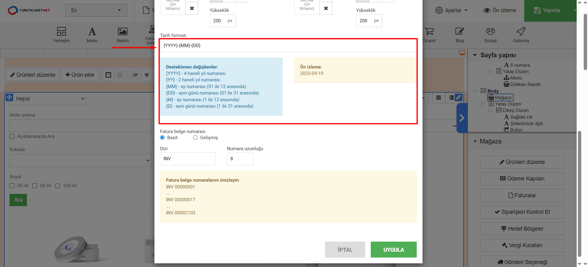 11. Tarih formatı” bölümünde faturada görünen tarihin formatını belirleyebilirsiniz. Eğer format belirleme konusunda desteğe ihtiyacınız olursa “Desteklenen değişkenler” bölümünden örnek değişkenleri görebilir ve buradaki örneklerden faydalanabilirsiniz. Tarih formatında bir değişiklik yaparsanız, yaptığınız değişiklikleri “Ön izleme” bölümünden anlık olarak görebilirsiniz.