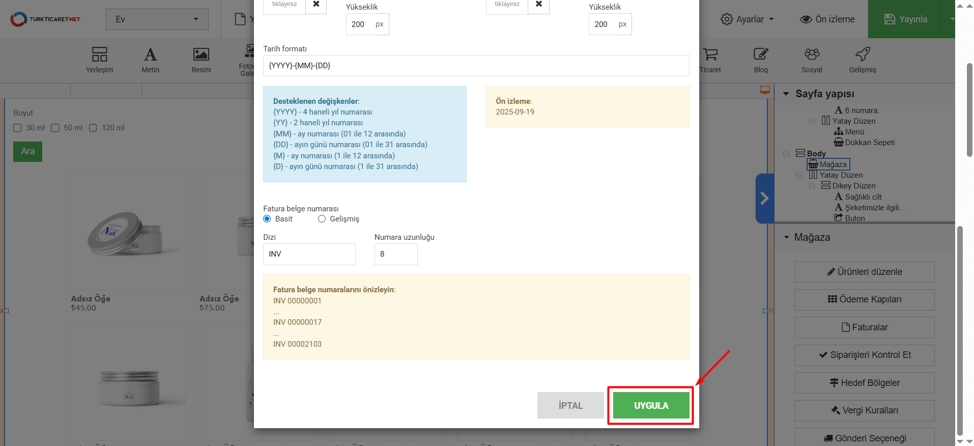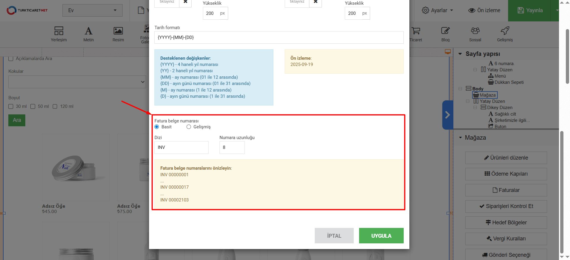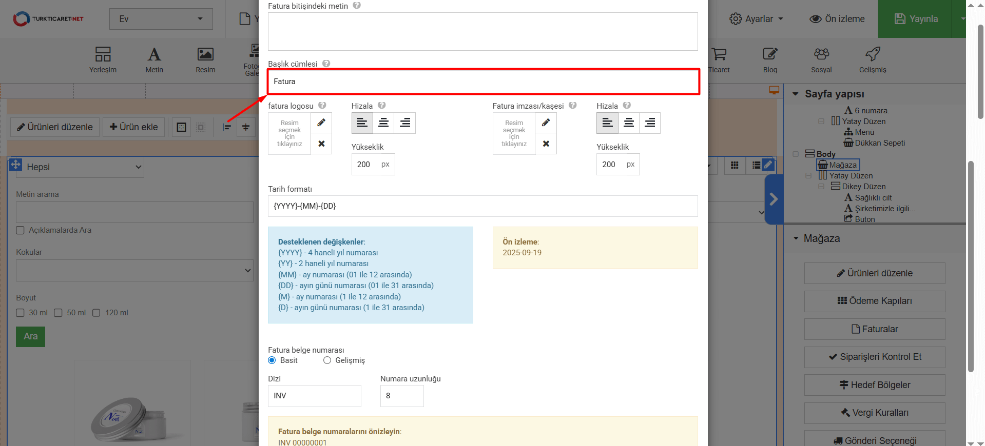 11. Tarih formatı” bölümünde faturada görünen tarihin formatını belirleyebilirsiniz. Eğer format belirleme konusunda desteğe ihtiyacınız olursa “Desteklenen değişkenler” bölümünden örnek değişkenleri görebilir ve buradaki örneklerden faydalanabilirsiniz. Tarih formatında bir değişiklik yaparsanız, yaptığınız değişiklikleri “Ön izleme” bölümünden anlık olarak görebilirsiniz.