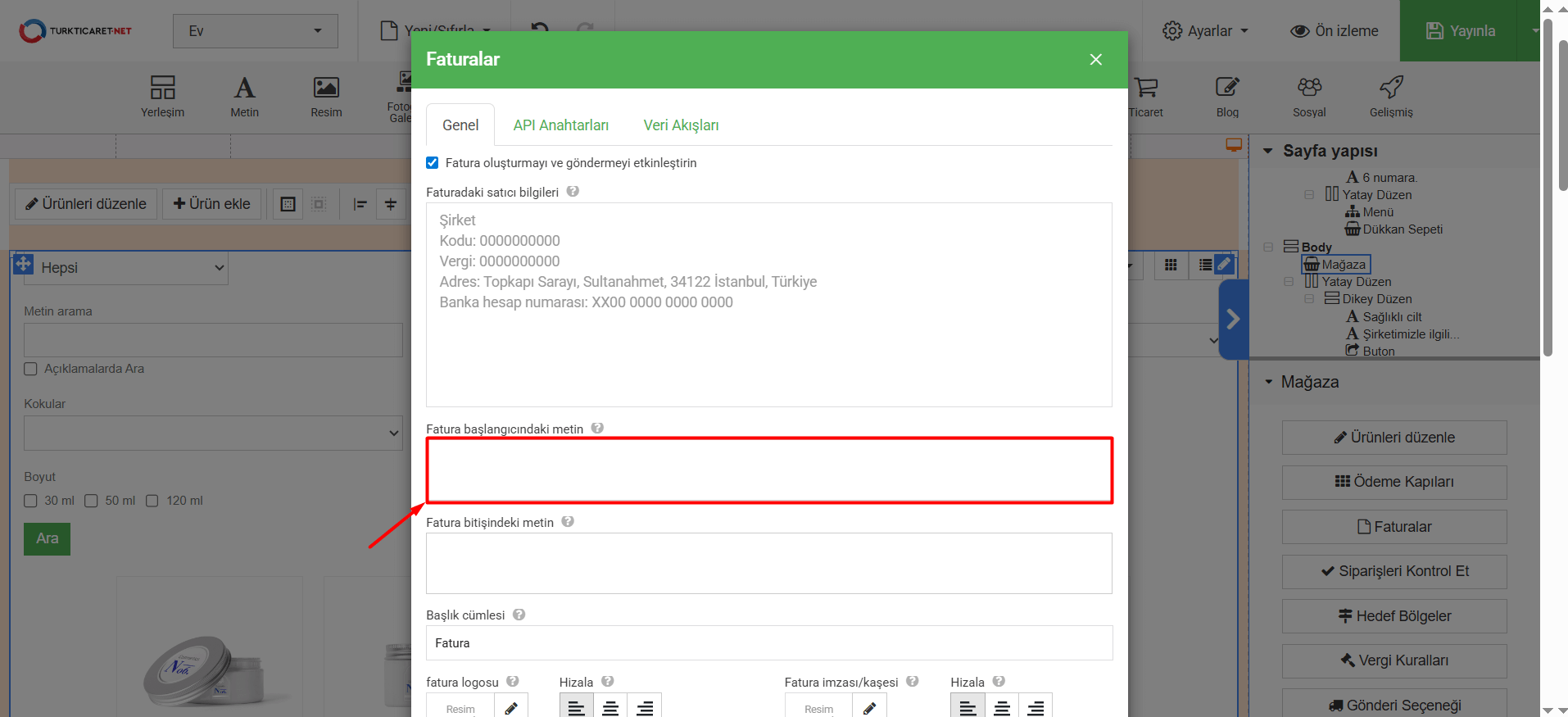 6. Fatura başlangıcındaki metin” bölümüne yazdığınız yazı, tüm faturaların başında görünecektir. “Satış Faturası” gibi tercihinize göre ek bir metin yazabilirsiniz.
