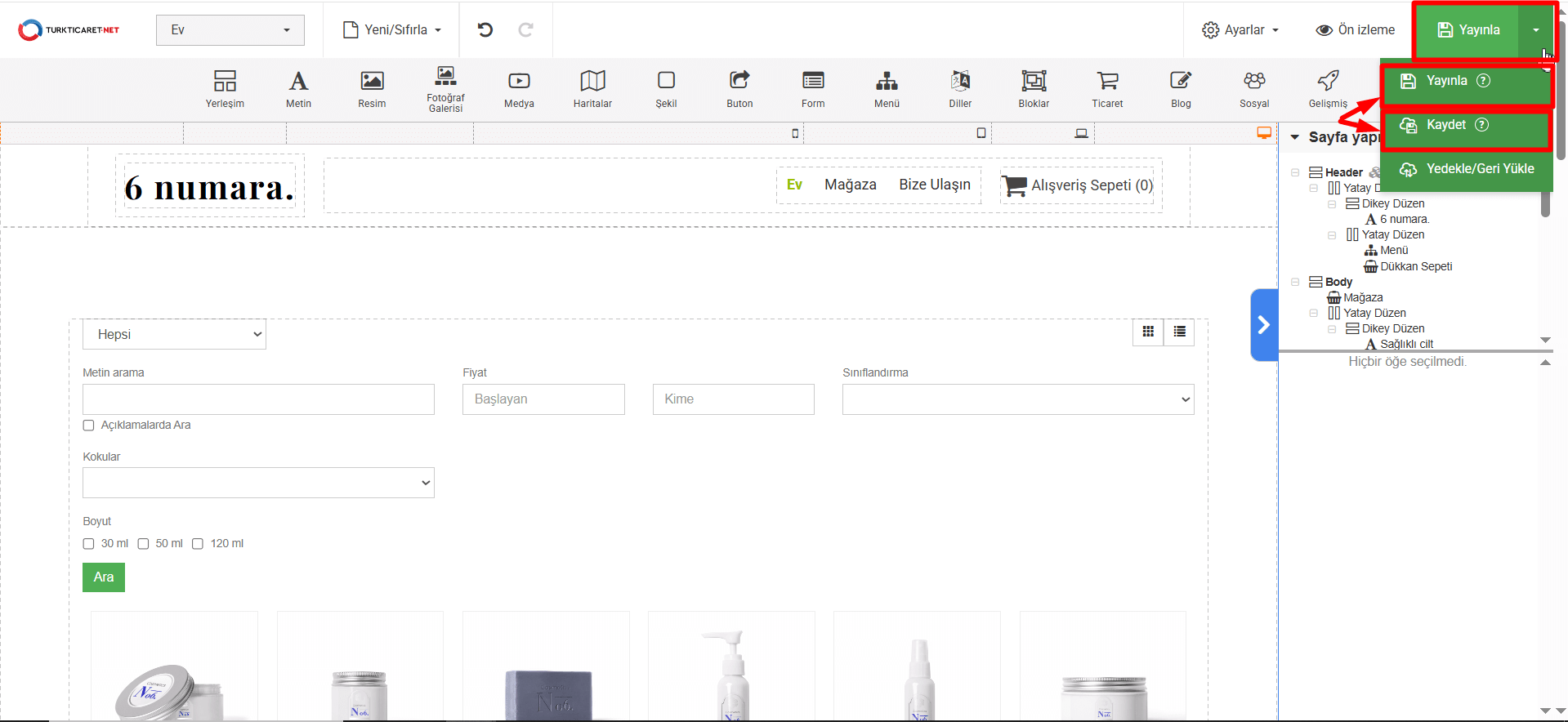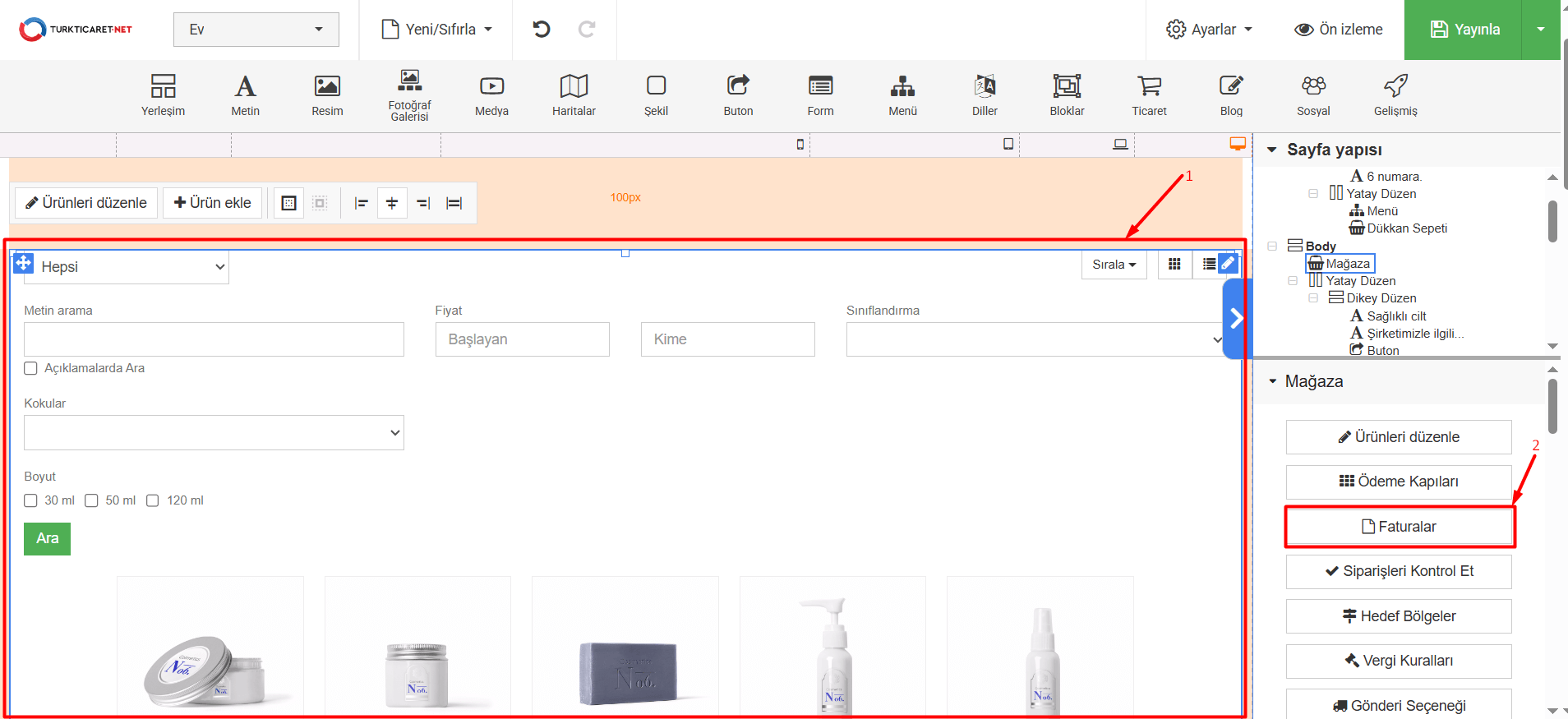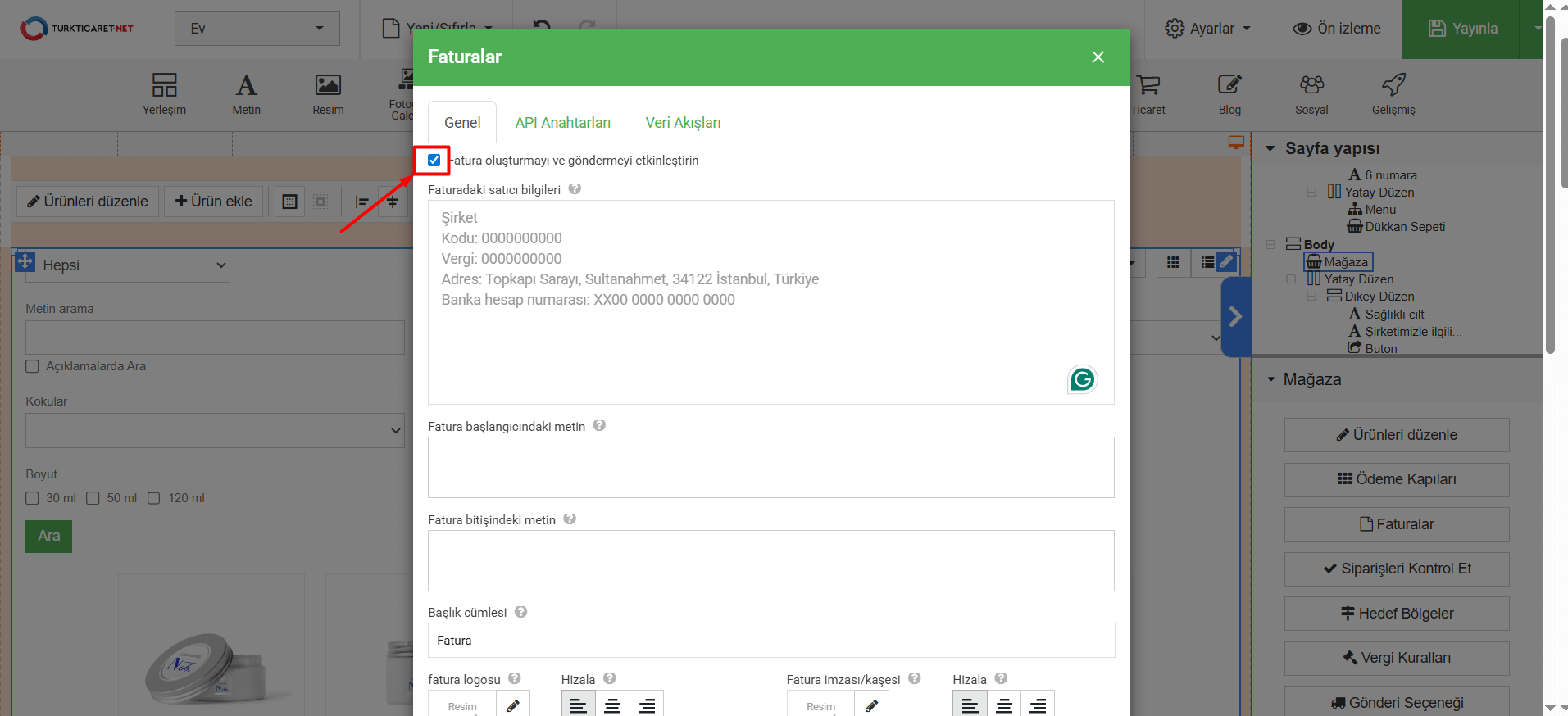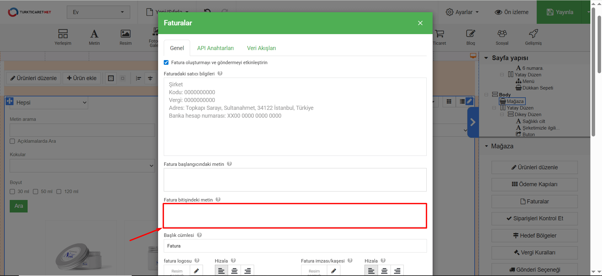 14. Eklediğiniz veya düzenlediğiniz faturayı sadece kaydetmek için “Kaydet” butonuna, yayına hazır olduğunda ise web sitenizde canlı olarak kullanılabilmesi için “Yayınla” butonuna tıklayın.