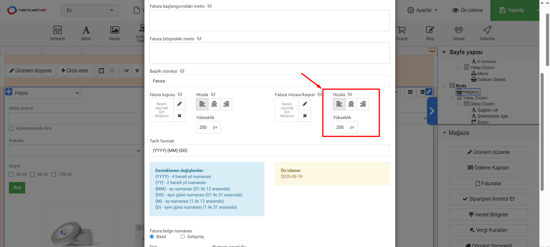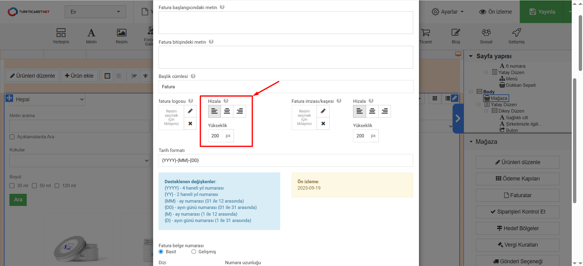 • Logoyu yükledikten sonra “Hizala” ve “Yükseklik” bölümünden faturanıza eklediğiniz logonun konum ve boyutunu ayarlayabilirsiniz