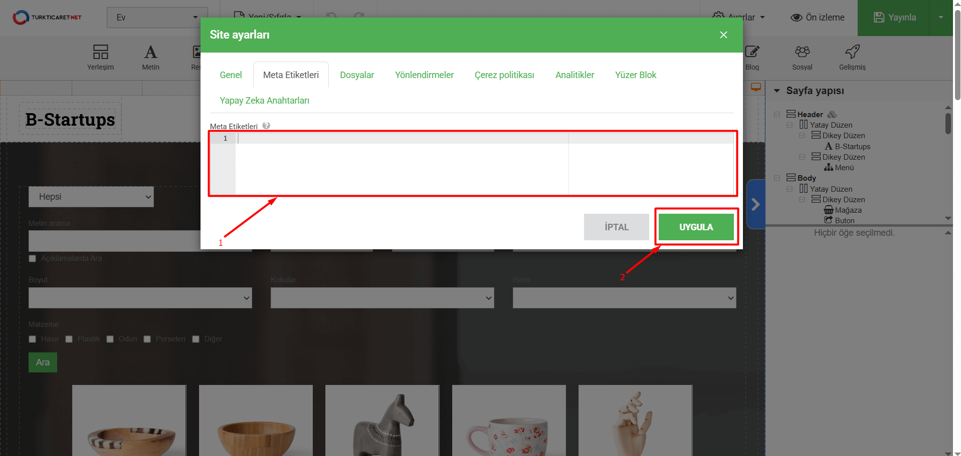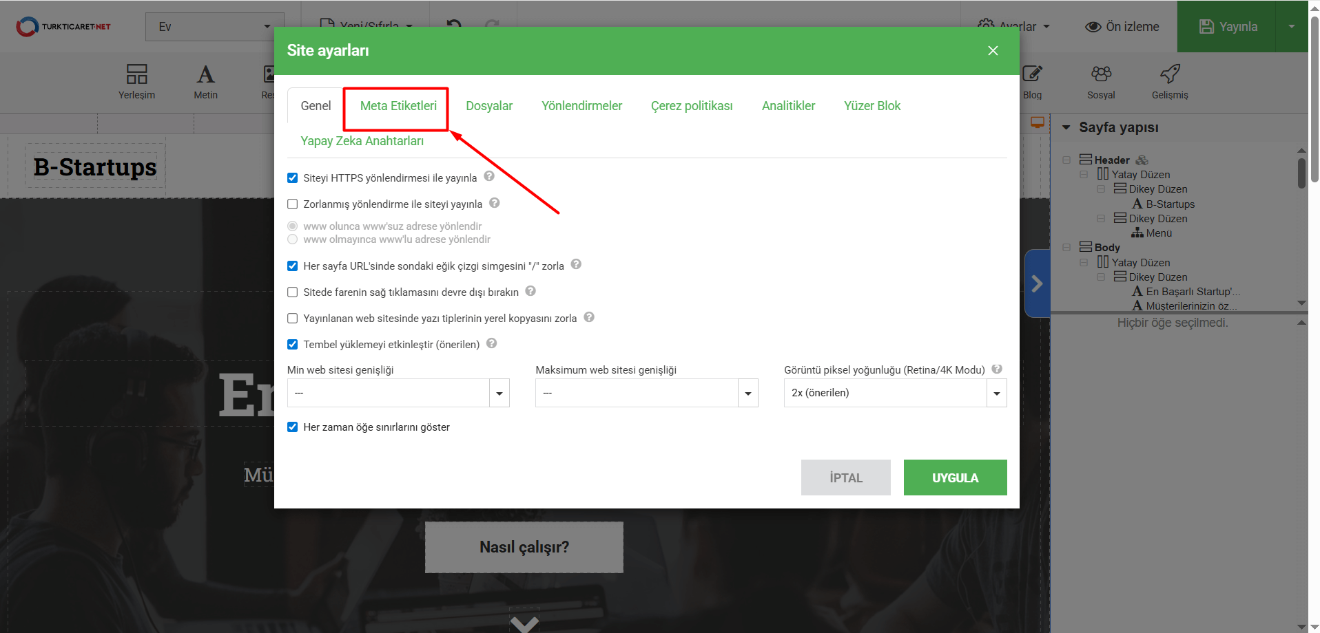 Hazır Site’de web sitenizi kolayca oluşturup yayına aldıktan sonra, sitenizin arama motorları ve tarayıcılar tarafından doğru şekilde tanınmasını sağlamak için mutlaka “HTML Meta Etiketleri” eklemeniz gerekir. Meta etiketleri, web sayfasının içeriğini tanımlayan küçük metin parçacıklarıdır. Sayfanızı ziyaret eden kişiler, eklediğiniz meta etiketlerini göremezler ancak Google gibi arama motorları bir sayfanın ne hakkında olduğunu, içeriğinde neler bulunduğunu anlamak için önce bu etiketlere bakar. Sitenizde doğru meta etiketlerinin kullanılması; arama sonuçlarında daha doğru, daha anlaşılır ve daha profesyonel bir şekilde görünmenize yardımcı olur. Bu sayede web siteniz daha çok kişiye ulaşabilir, daha fazla tıklama alabilir ve hedef kitlenize daha kolay ulaşabilirsiniz. Eğer siz de Hazır Site’de oluşturduğunuz bir web sitesine meta etiketleri eklemek istiyorsanız aşağıdaki adımları takip edebilirsiniz.