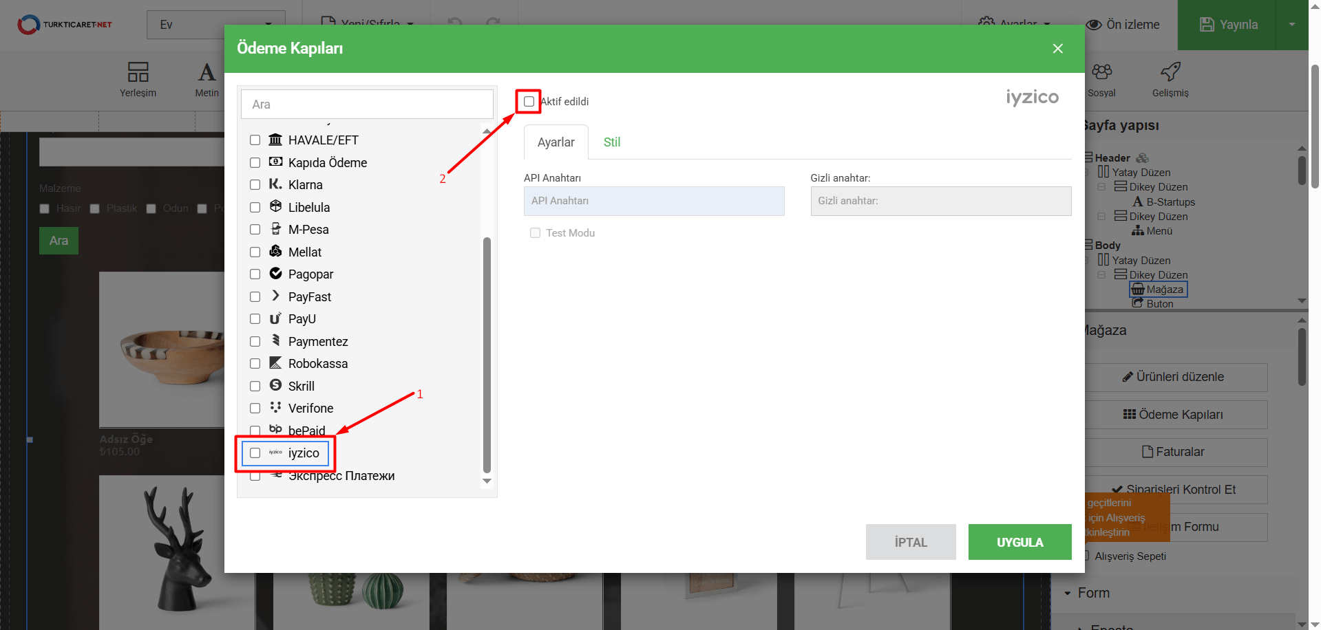 Hazır Site’de bir e-ticaret modülü kullanıyorsanız ve web sitenizden alışveriş yapan kullanıcılardan İyzico ile ödeme almak istiyorsanız aşağıdaki adımları takip edebilirsiniz.