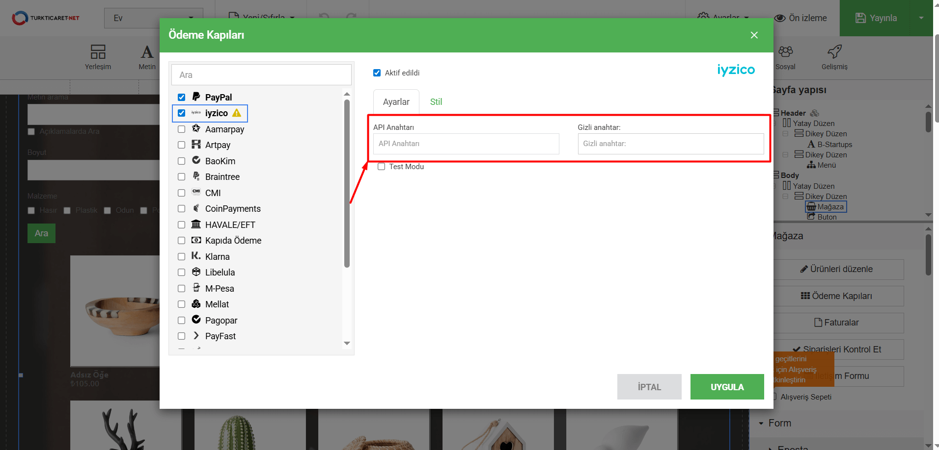 Önemli Bilgi: İyzico ödeme yöntemini kullanabilmek için öncelikle İyzico üzerinden gerekli başvurularınızı tamamlamış olmanız gerekir. Ayrıca ödeme entegrasyonunun çalışabilmesi için API Anahtarı ve Gizli Anahtarı da İyzico tarafından temin etmelisiniz.