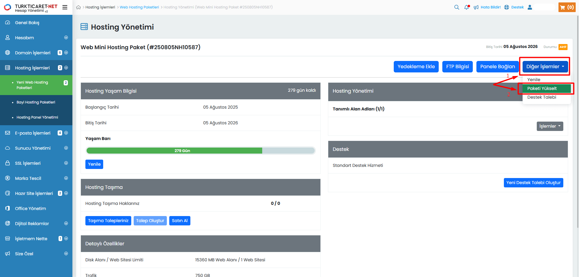 - Hosting yönetim sayfasına ulaştığınız zaman sağ bölümünde bulunan “Diğer İşlemler > Paketi Yükselt” butonuna tıklayın.