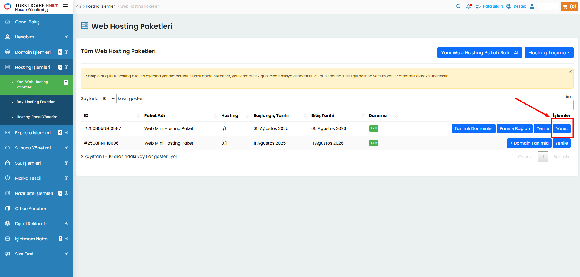 - Açılan sayfada mevcut hosting hizmetleriniz listelenecektir. Yükseltmek istediğiniz hosting paketinizin yanında bulunan “Yönet” butonuna tıklayın. Eğer ekranda “Yönet” butonu görünmüyorsa, bunun nedeni domain tanımlı olmamasıdır. Hosting paketinize domain tanımlayarak işlemlere devam edebilirsiniz.