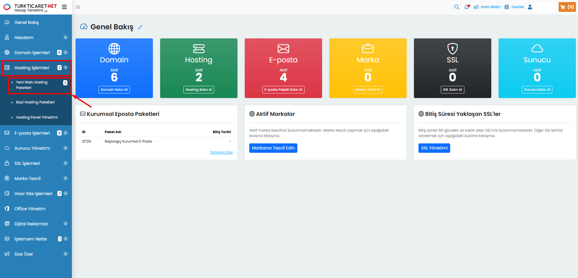- Sol menüde bulunan “Hosting İşlemleri” butonuna tıklayın. Açılan listeden “Yeni Web Hosting Paketleri” butonuna tıklayın. Eğer hizmetiniz bir Bayi Hosting ise bu durumda “Bayi Hosting Paketleri” butonuna tıklayın.