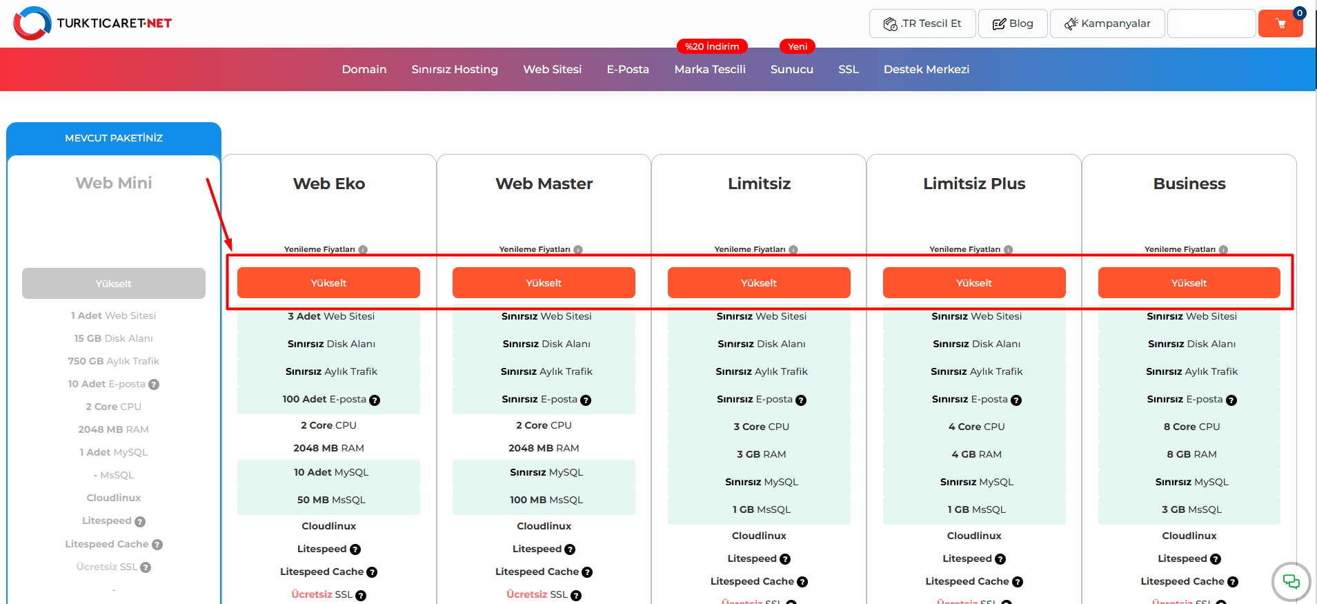 - Açılan sayfada yükseltebileceğiniz yeni hosting paketleri listelenecektir. Hosting paketlerinde görünen fiyatlar ise kalan kullanım hakkınız düşülerek hesaplanan size özel tekliflerdir. Hosting hizmetinizi hangi pakete yükseltmek istiyorsanız ilgili paketin “Yükselt” butonuna tıklayın.