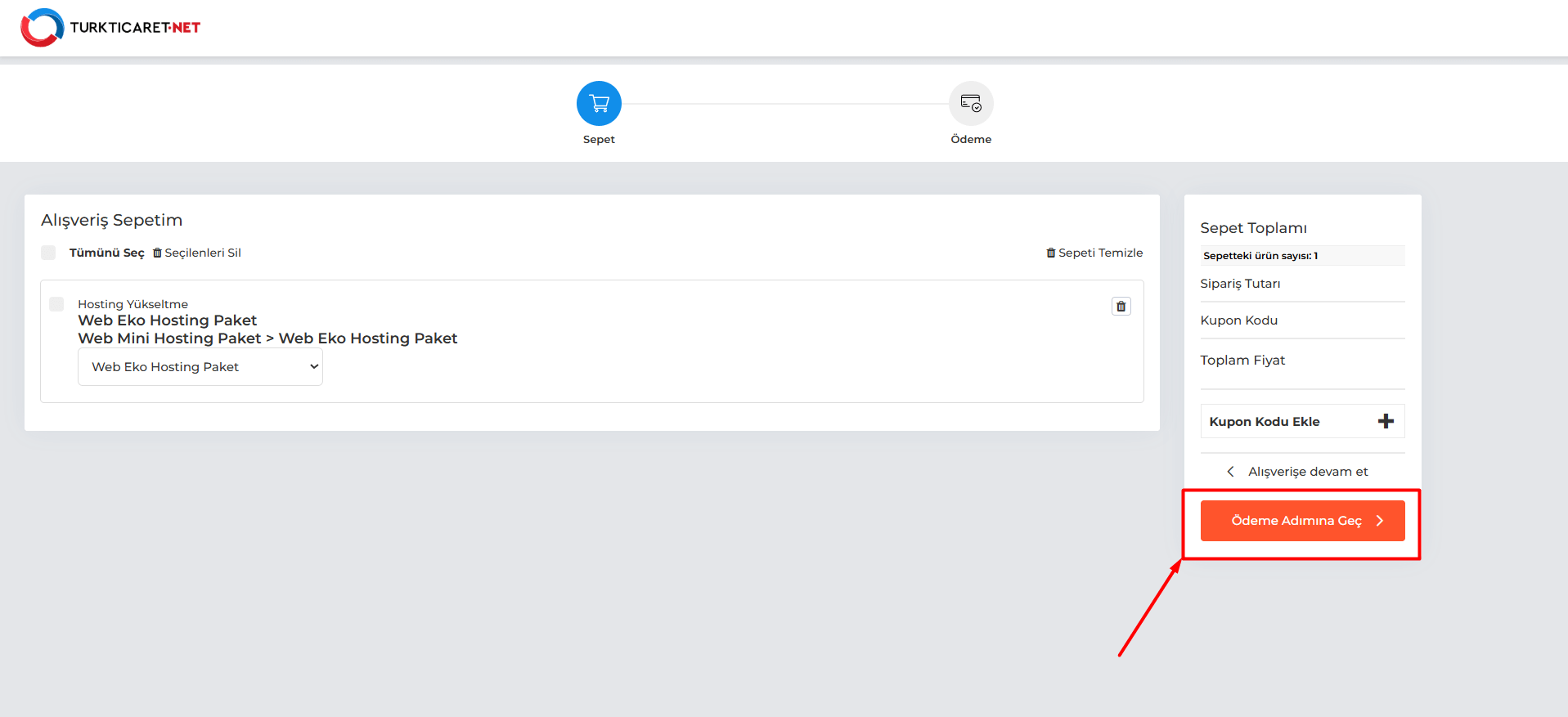 - Yükselt butonuna tıkladıktan sonra seçtiğiniz paket sepetinize eklenecektir. Alışveriş sepetinizi kontrol ettikten sonra “Ödeme Adımına Geç” butonuna tıklayın.