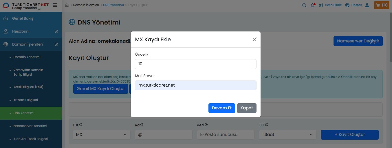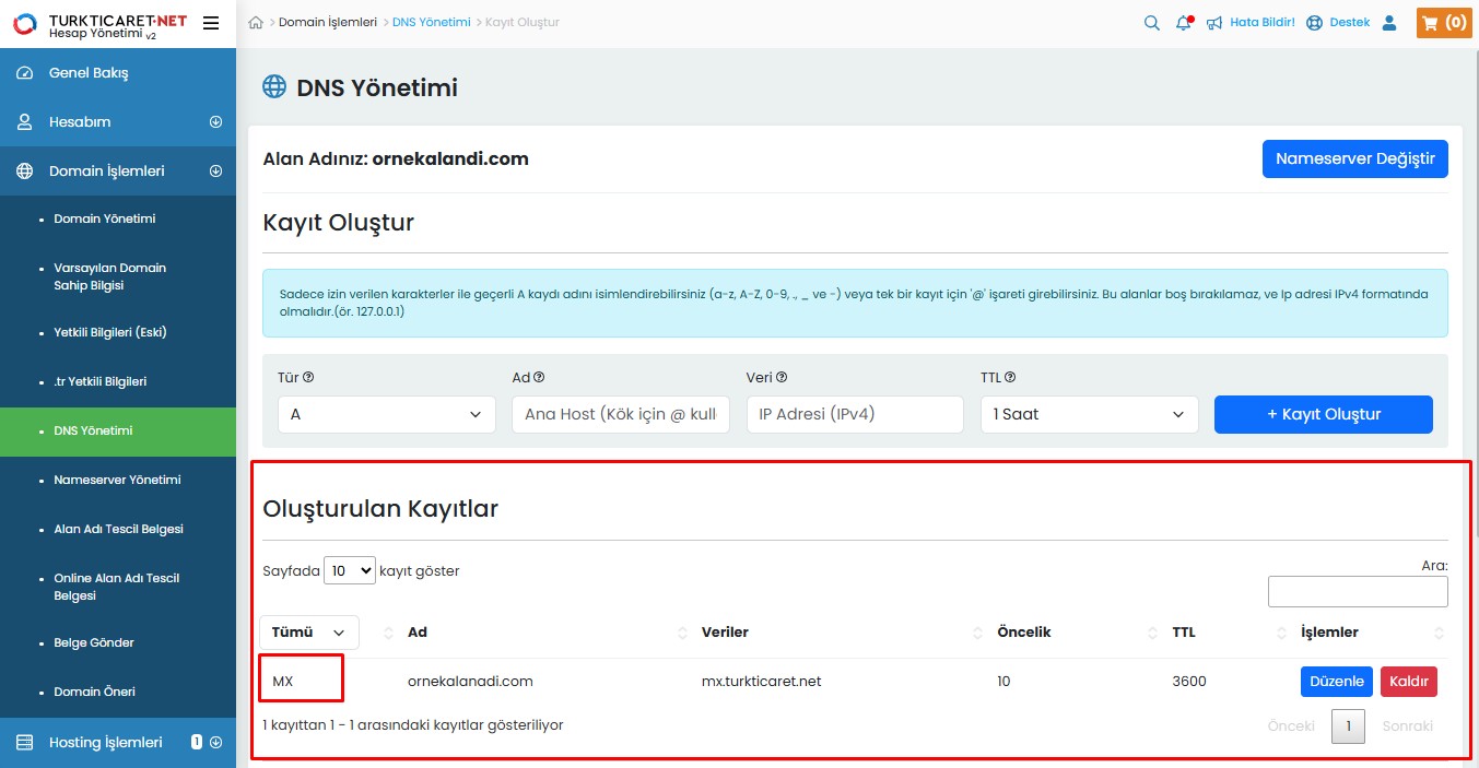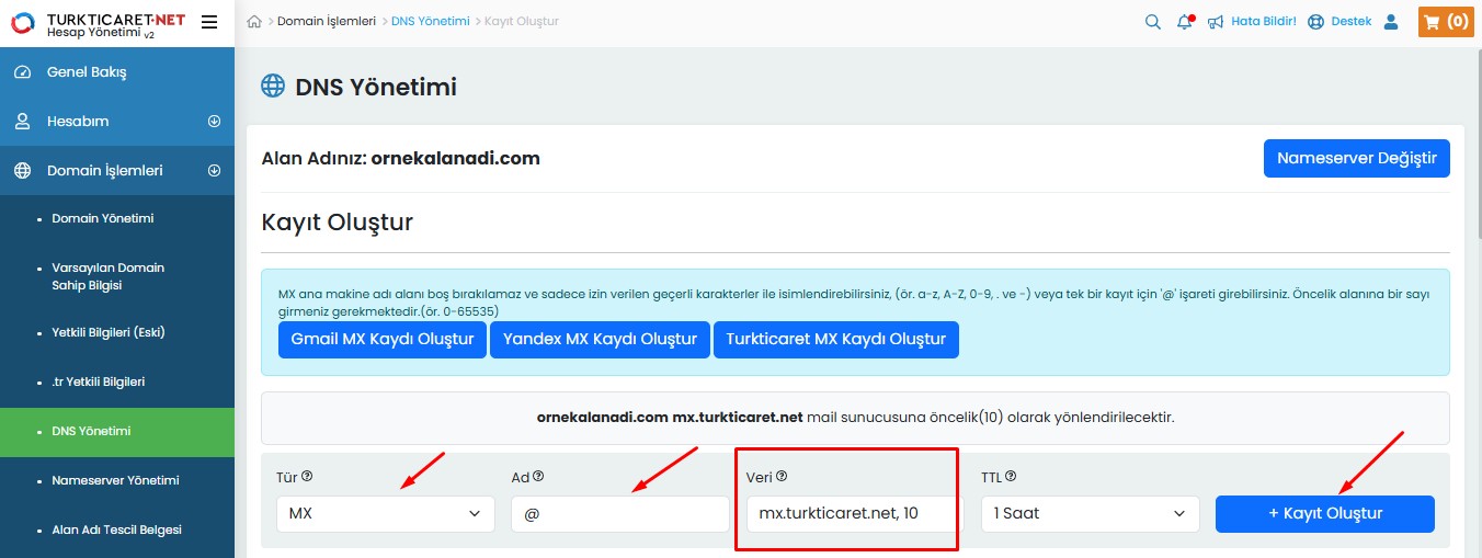 Not: Turkticaret.Net üyeliğiniz içerisinde Turkticaret.Net’ten aldığınız e-posta hizmetinizin kurulumunu gerçekleştirdiğinizde MX kaydınız otomatik olarak oluşacaktır. Ek bir işlem yapmanıza gerek bulunmamaktadır.