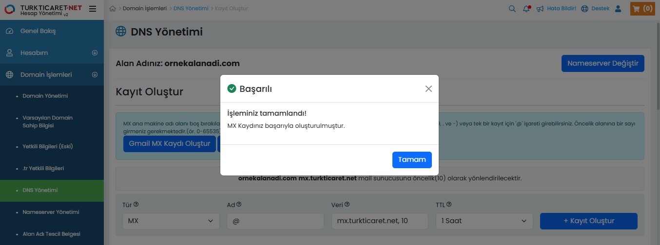 - Firmamıza ait mail kayıtları için “Turkticaret Mx Kaydı Oluştur” butonu ile kayıtlarınızı hızlı ve kolay bir şekilde oluşturabilirsiniz.